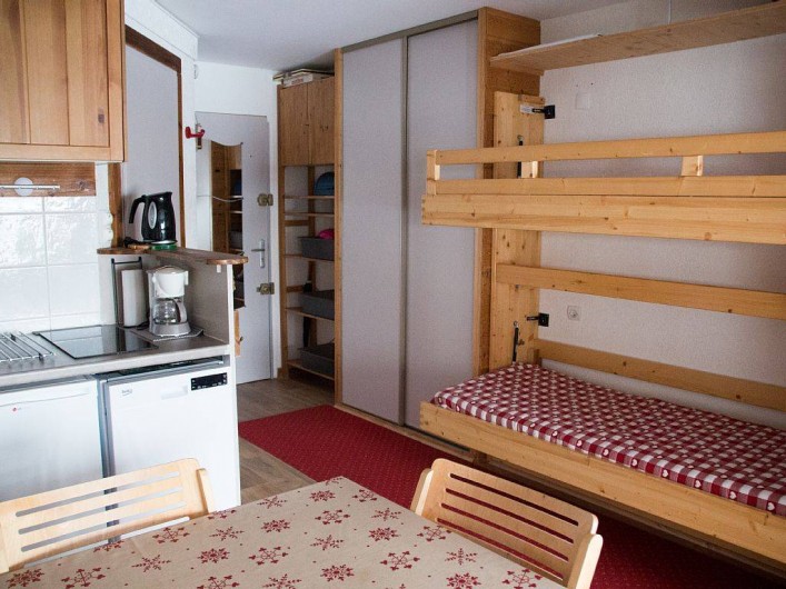 Entièrement en parquet, on trouve l'entrée, la salle de bains, des rangements, le coin cuisine et 2 lits superposés rabatables.,