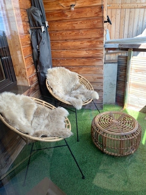 - un balcon avec deux fauteuils et une table basse pour profiter du soleil et de la vue