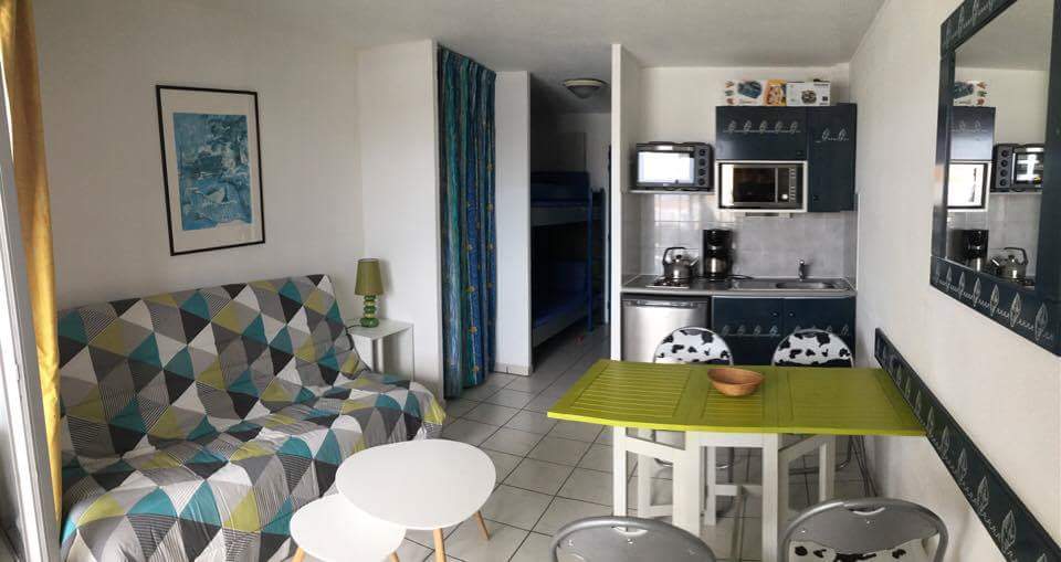 A 40 m de la mer, accès direct plage sans route à traverser. Coin cabine, 2 lits superposés pour enfants, et canapé lit clic clac grand confort 2 personnes.