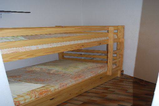 Descriptif: entrée, première porte à droite chambre cabine fermée avec deux lits superposés en 90X190, avec tiroirs de rangement, deuxième porte à droite salle d'eau équipée d'une cabine de douche fermée, et WC. Pièce principale avec coin cuisine équipée plaque vitro, grand frigo avec congélateur, four et large équipement de vaisselle,TV écran plat, couchage lit