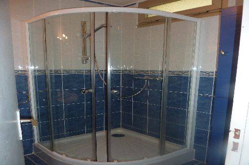 Salle de bains entièrement refaite,carrelée,meuble ss vasque avec asp.,bassine,meuble vertical avec tiroirs et rangement câble asp.,miroir avec spots,porte-savons,porte-serviettes,porte-peignoirs. Cabine de douche en arrondi, à double portes.. Meuble