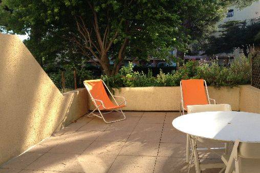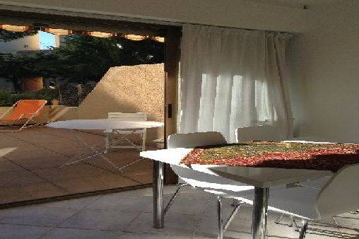Location d'un studio de 30m2 avec cabine indépendante, terrasse de 18m2, parking privé numeroté dans parc boisé et fleuri au calme. 1 couchage 2 personnes adultes, couchage cabine 2 lits superposés enfants. Salle de bains, wc séparé. Cuisine équipée. Commerces, restaurants à proximité. Plages à 5 mn à pieds.