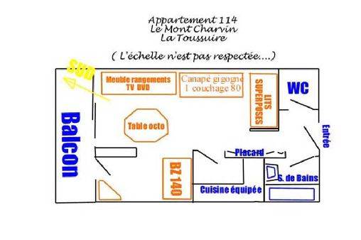 Appartement 32 m2, orientation sud, séparable en 2 pièces séparées par cloison mobile manipulable sans effort, couchages confortables 5 personnes au dernier étage (3ème) du petit immeuble Le Mont Charvin (n° 13 sur le plan du site web de La Toussuire) . Situé idéalement à 150 mètres du front de neige, à 50 mètres du magasin Utile . Achat forfaits et départ skis aux pieds à 50 mètres de l'immeuble vers le Télésiège du soleil ; retour skis au pieds sans problème. Arrêt navette gratuite au pied de l'immeuble.