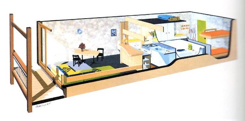 • Il se compose d’une entrée, d’un coin montagne, d’une salle de bains (baignoire et WC), d’une cuisine, d’un séjour et d’un grand balcon