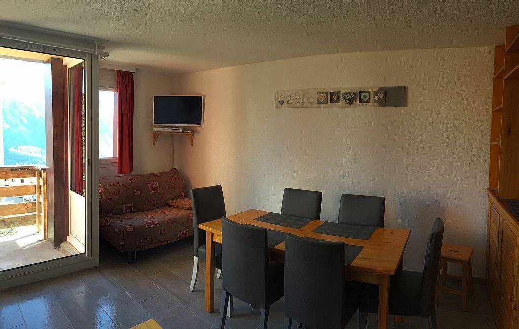 accueillant un lit 2 places superposé à un lit une place et un lit gigogne pouvant servir de lit double ou de 2 lits 1place. Dans cette mezzanine, il y a également un écran plat avec DVD, placard et commode. Salle de bain neuve avec baignoire, placard et machine à laver le linge. Le WC est séparé. Balcon avec table. Appartement en parfait état. Boulangerie et supermarché des la sortie de l immeuble, médecins au RDC et pharmacie en face. Belle vu dégagée sur la montagne et la place du Queyrelet. Exposition plein sud. De nombreuses activités dans cette station même pour les non skieurs comme palais des sports avec piscine( toboggan), patinoire, cinéma, spa, bowling etc... De nombreuses activités l ete également avec une superbe base de loisirs.