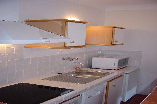 Cuisine kitchenette, isolée par un muret à mi hauteur comprenant plaque de cuisson, four à pyrolise, réfrigérateur, lave vaisselle, micro ondes, évier..;