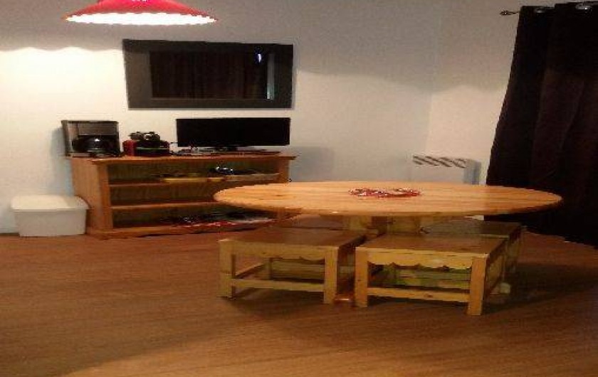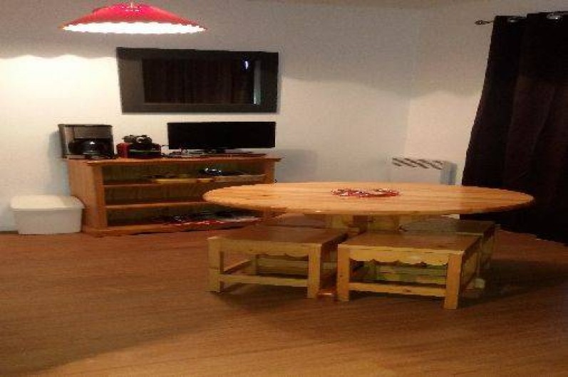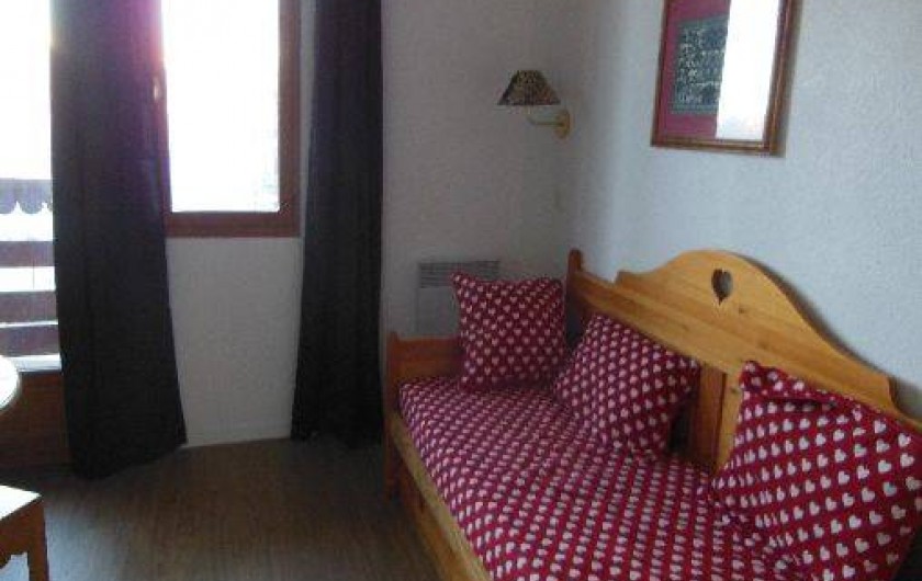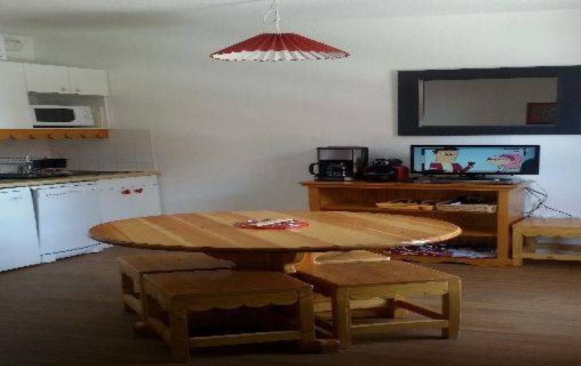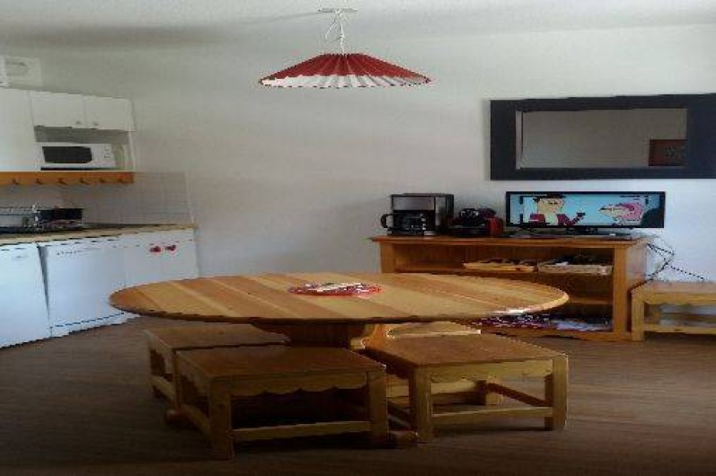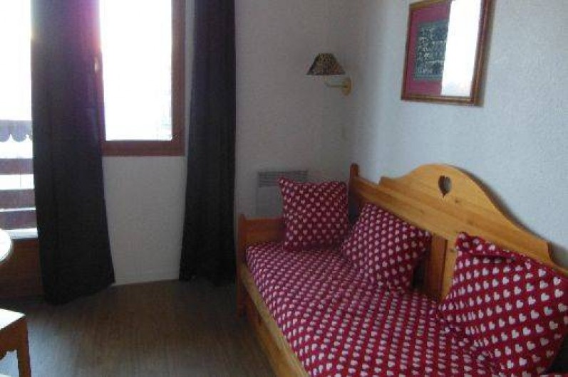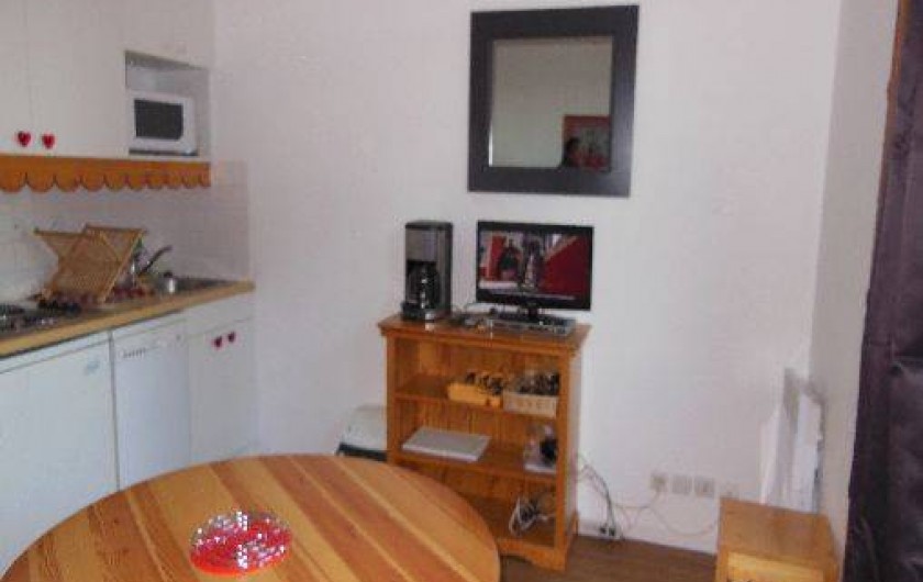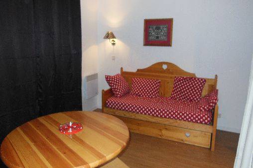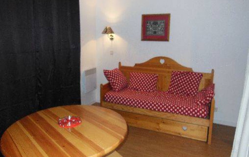 Joli séjour ensoleillé avec balcon, équipé de lit gigogne. Coin cuisine équipée.