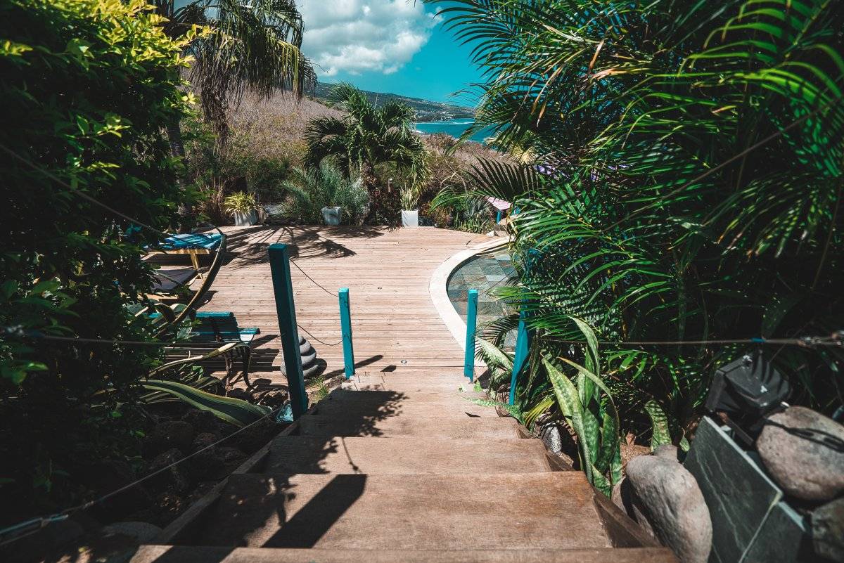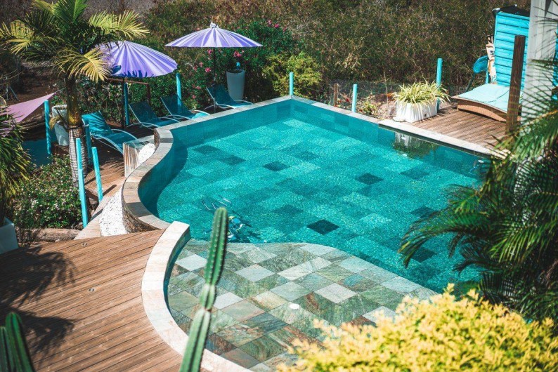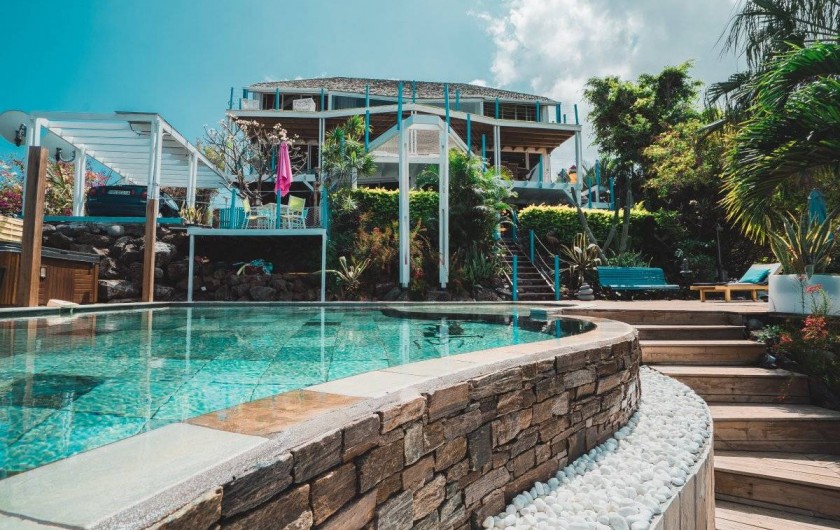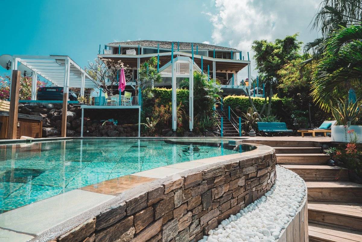 Ici, presque tout est fait main : maison en bois, piscine à débordement, en ardoise, jardin tropical avec bassins de carpes Koï, solarium, boma avec cuisine extérieure au feu de bois, jacuzzi.