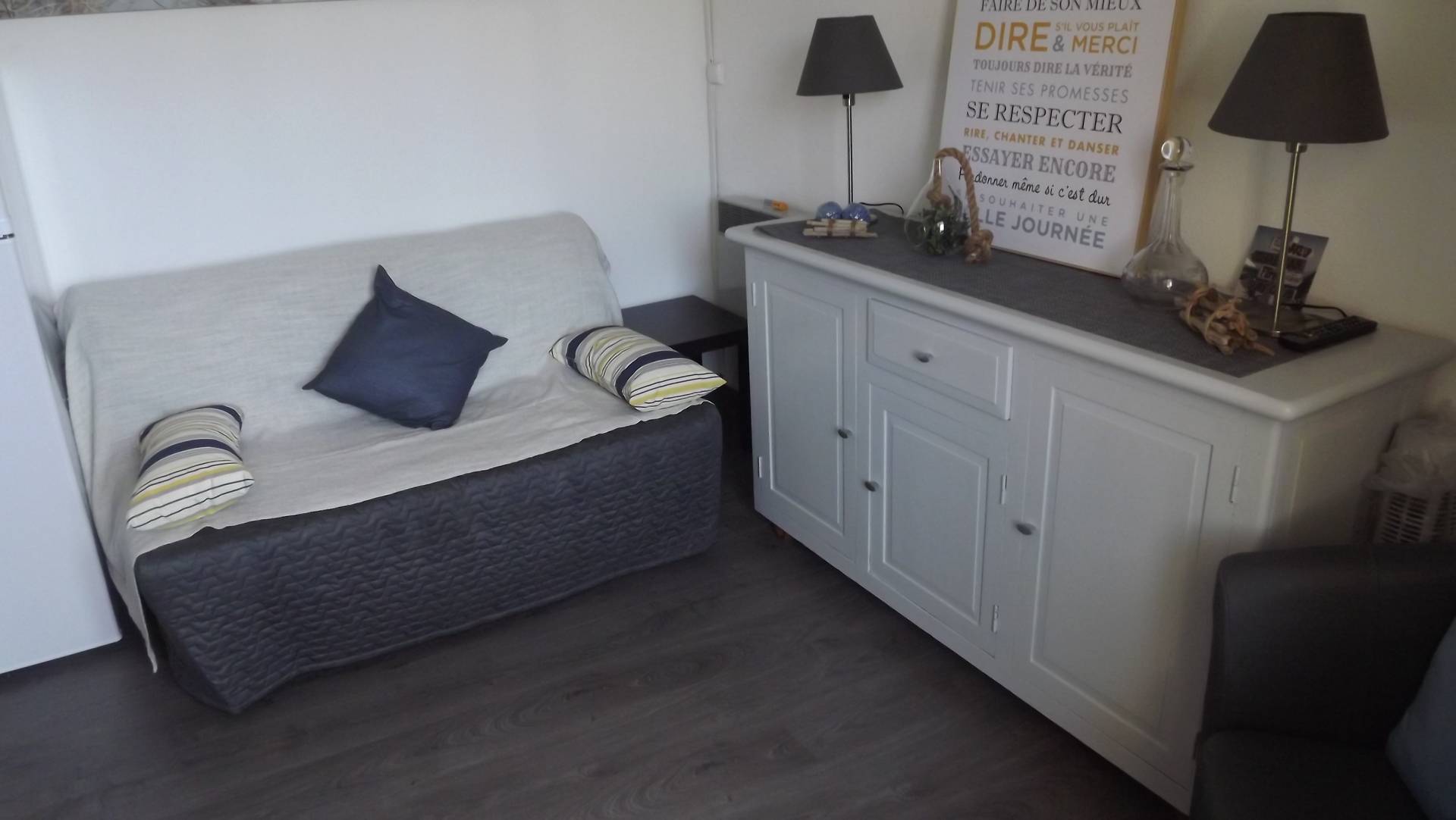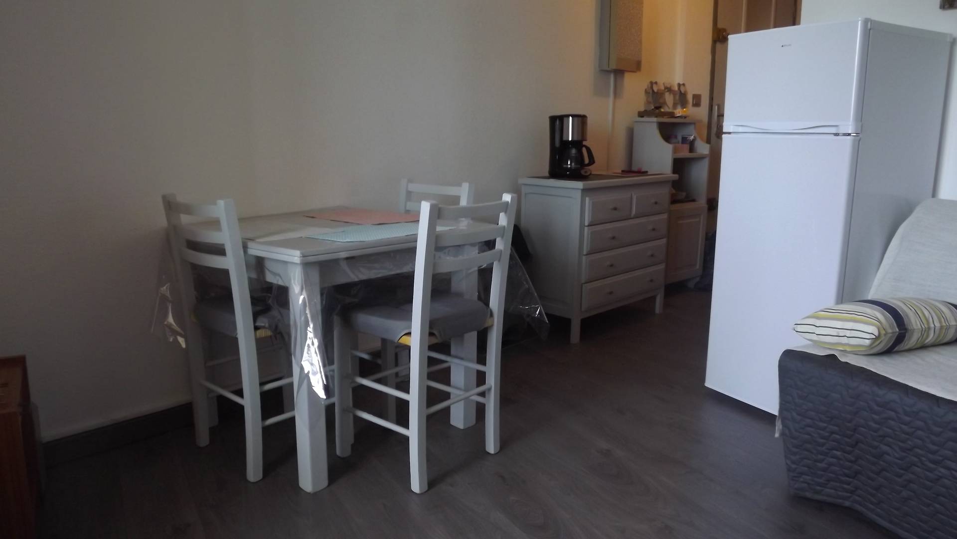 Appartement de 35 m2 + loggia au 1er étage d'une résidence calme et agréable (6 couchages). parking numéroté à proximité de l'appartement. 1 boulodrome, 2 court de Tennis accès par badge fourni , grande piscine avec plage, sécurité assurée par un maître nageur. Appartement situé à 600 m du centre, de tous commerces et des plages. Appartement refait à neuf fin 2017. 1 chambre grand lit de 2 personnes, cabine avec lits superposés indépendant, un canapé BZ de deux personnes.