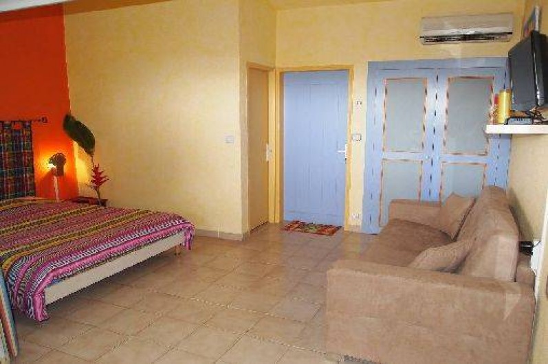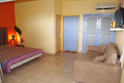 Agencement : 1 chambre climatisée (lits double), 1 salle d'eau (douche, lavabo, wc), salon avec canapé convertible, cuisine équipée, terrasse et piscine commune à la résidence.