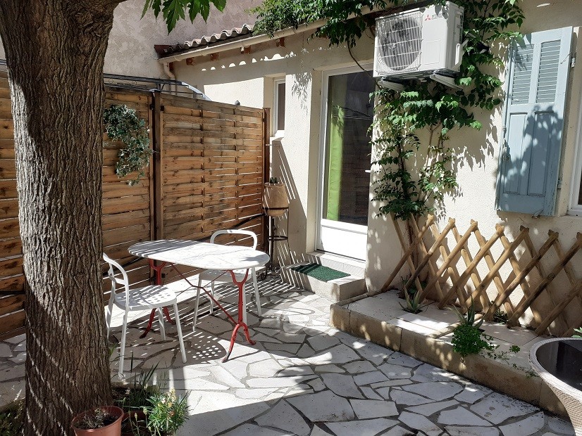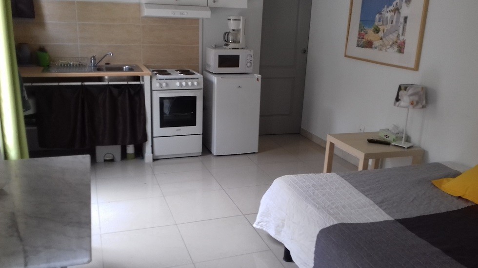 Studio 26 m² en rez de jardin avec extérieur, lit 1,40 m avec lit bébé, coin cuisine + salle de bain WC