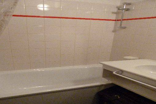 * Salle de bain avec baignoire, grand lavabo, sèche serviettes, sèche cheveux et toilette.