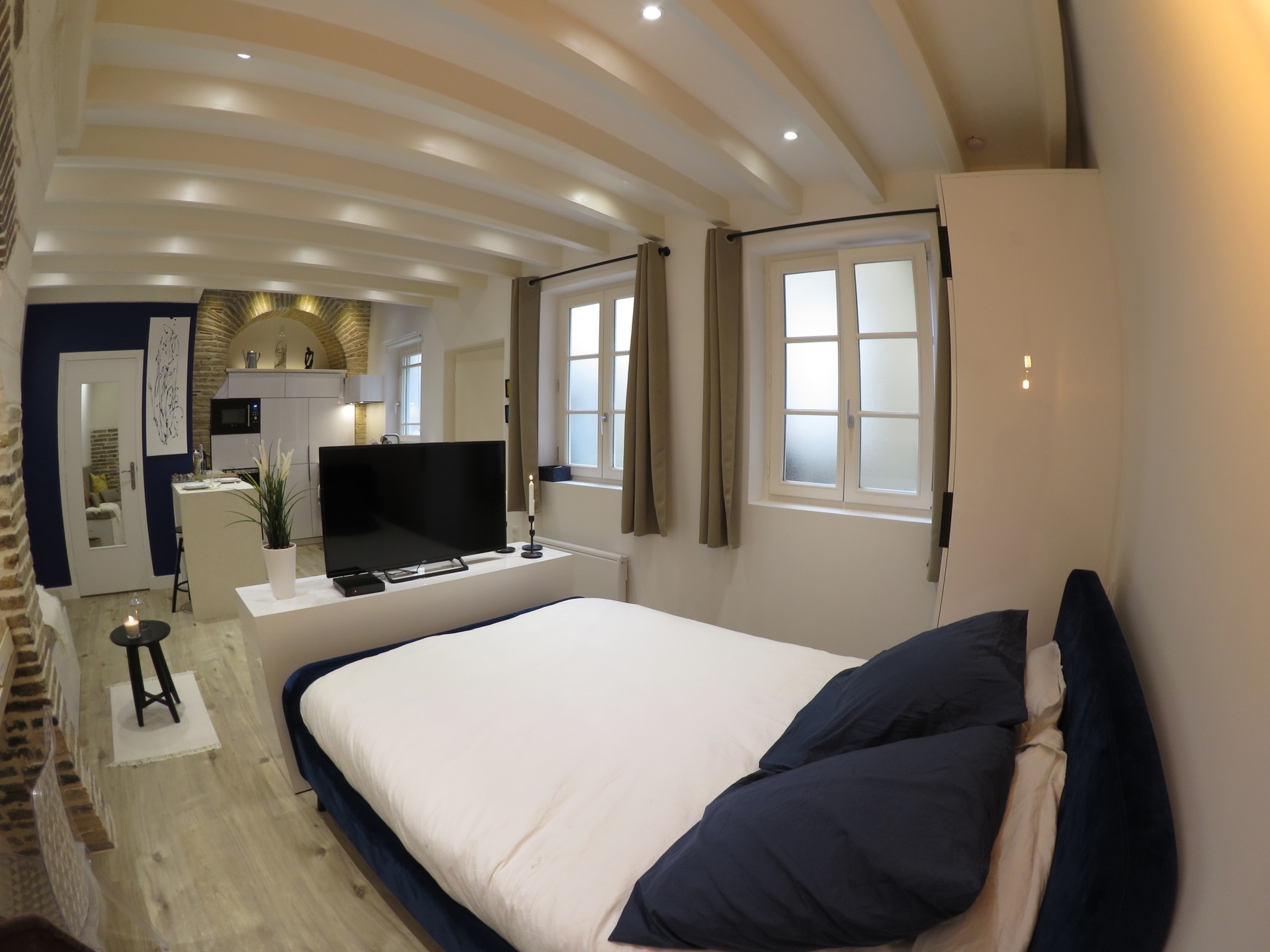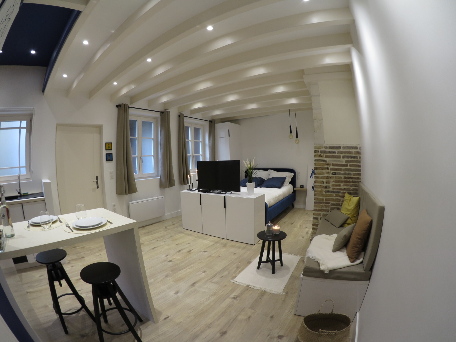 - Un intérieur très charmant : lit haut gamme, rangements, télévision. Un coin repas avec une table à manger pour 2 personnes.