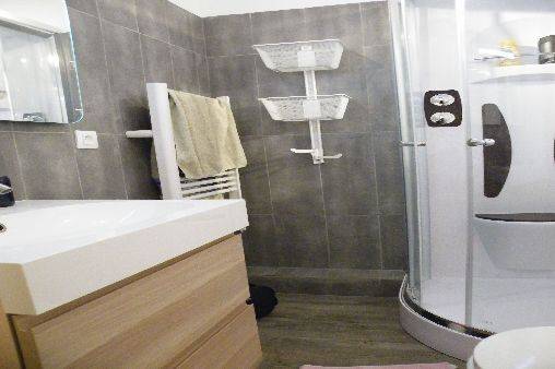 -1 salle de bain avec cabine de douche, sèche serviettes
