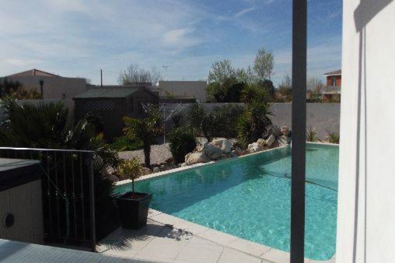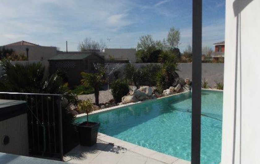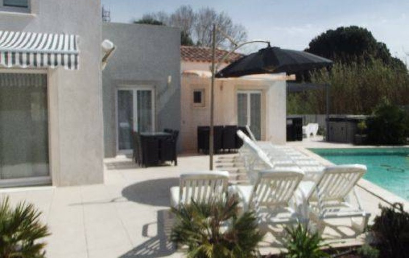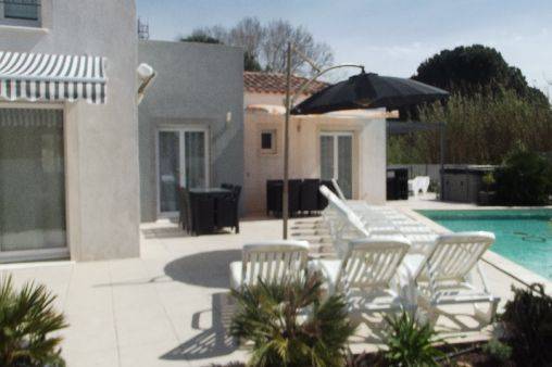 GRANDE VILLA avec spa et une piscine à débordement de 10.20 SUR 5.20 et jacuzzi accessible de 3 chambres et du séjour. La villa se situe a proximité du centre ville (1.3 km) et du zoning commercial de Agde.Centre d'équitation a 600 M et Piscine ultra moderne (centre de massage,spa,sauna,etc.) . 5 lits sont de 160 CM et 2 lits 140cm,LES 3 " CHAMBRES DU BAS SONT CLIMATISÉS COMME LE SÉJOUR .Cuisine super équipée avec frigo américain,grand séjour de +80m² avec baies vitrées donnant directement vue sur piscine,grand canapé cuir dans salon avec écran plat de 110cm dans … séjour et 3 chambres .Terrain de plus de 1250m² arborées de palmiers et autres tout murés.Transats et salle a manger extérieur .table de tennis et terrain de pétanque . Lire moins Lire la suite