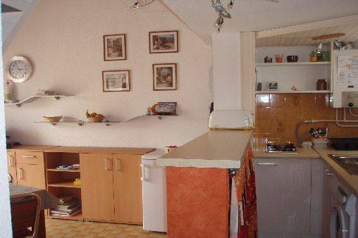 Au rez de chaussée une cuisine ouverte sur coin repas, télévision, lave vaisselle, four, four micro ondes, grill pain, cafetière et lave linge