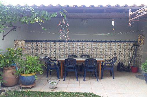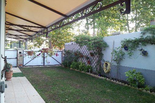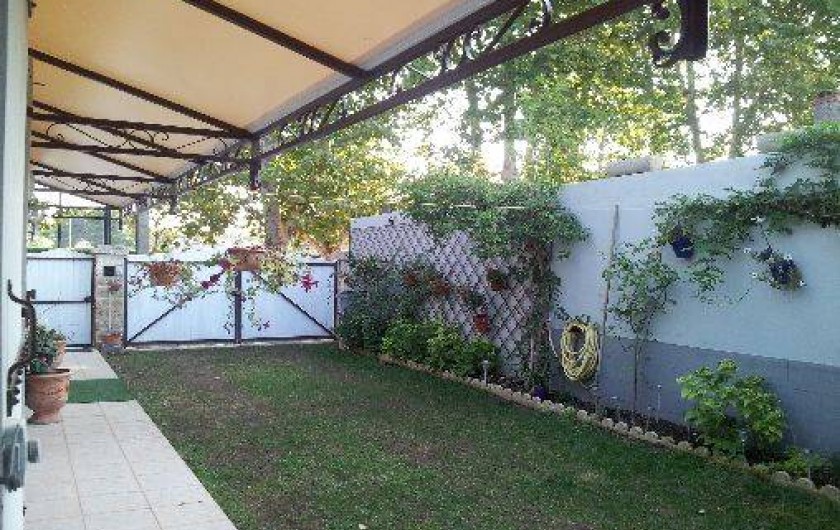 En passant le portail vous découvrez un parking clos, privé, et engazonné pour deux véhicules, avec cour intérieure avec stores et abri terrasse équipé d'un salon de jardin, barbecue électrique, avec baies vitrées pour accès à l'intérieur de la villa.