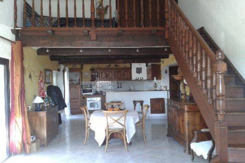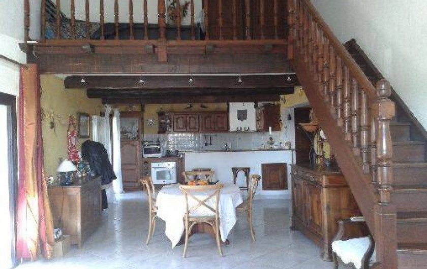 A l'étage, un escalier en bois vous emmène sur une mezzanine-chambre comprenant un lit pour deux personnes et mobilier.