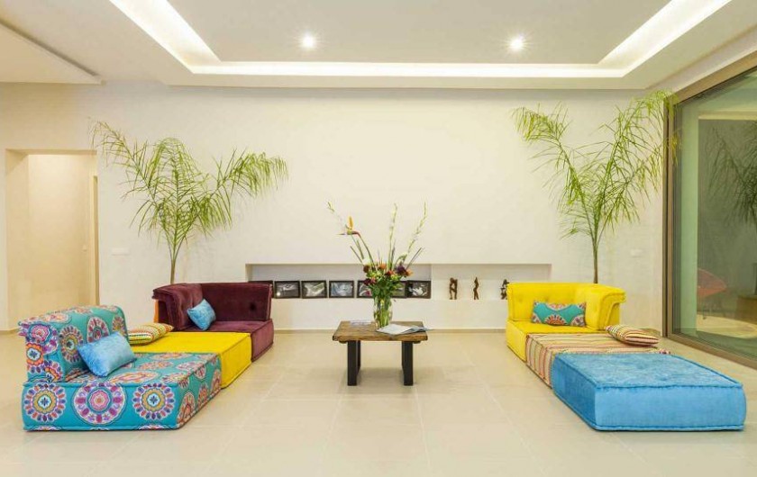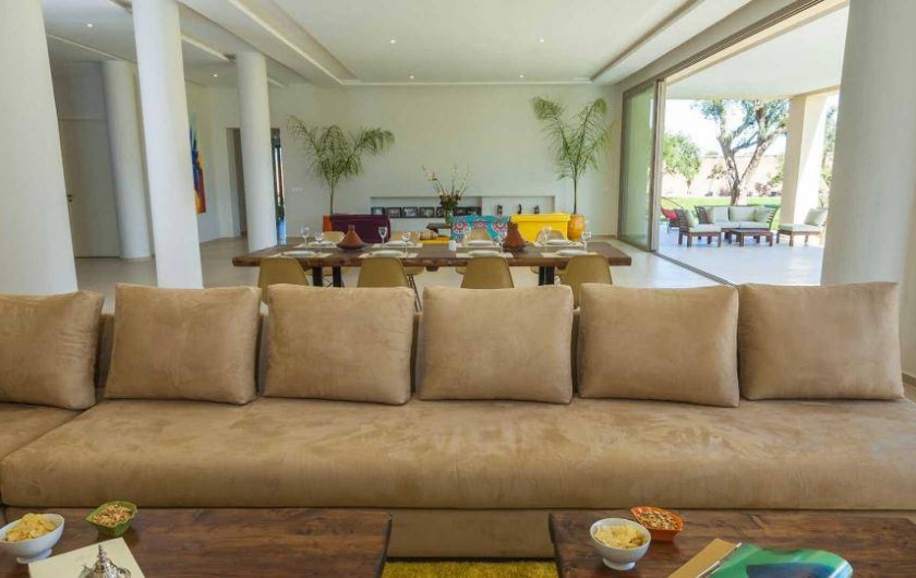 - Un salon détente Mah-jong pour vos lectures face à la baie vitrée à galandage de 10m donnant sur la terrasse couverte et la piscine couloir