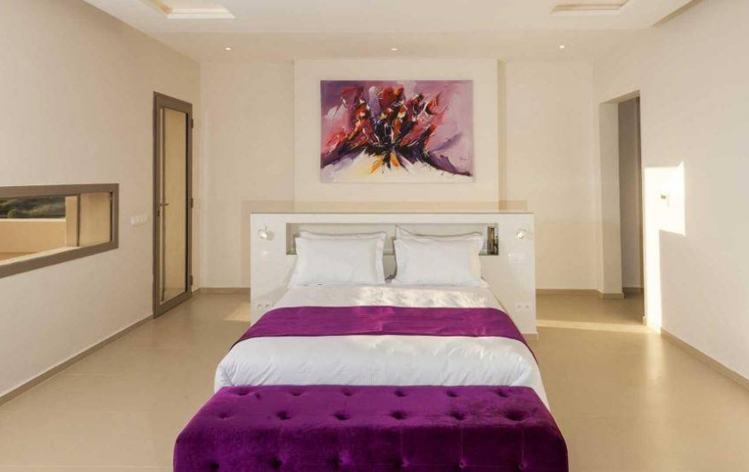 - La Suite Violette : Lit double Tv full HD avec Canal satellite, fauteuil, salle de bain avec double vasque, baignoire, douche à l’italienne et wc , Dressing ,coffre-fort, climatisation réversible, internet Wi-Fi, 2 terrasses dont une privative.