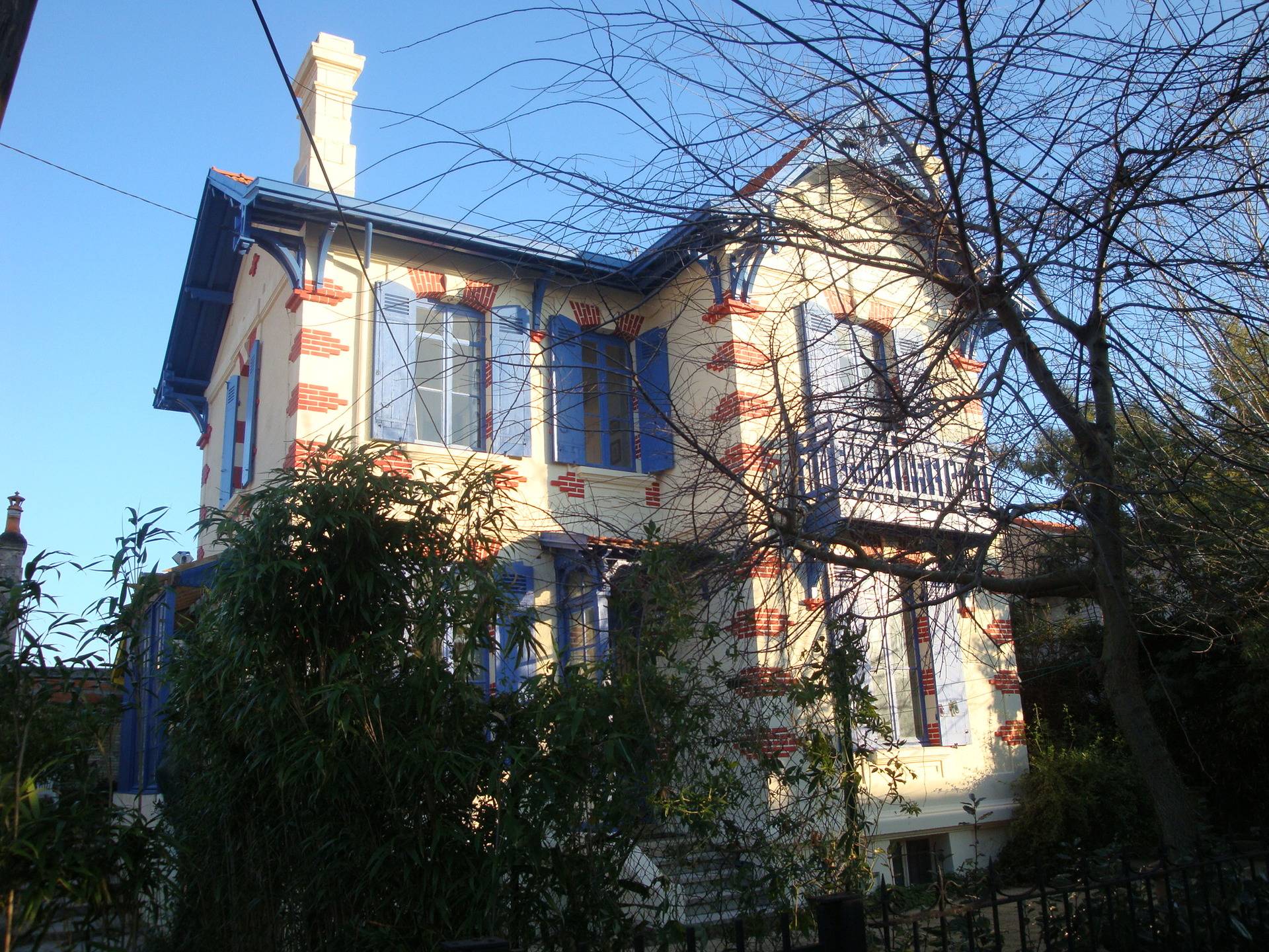 1/ Villa de type arcachonnaise, 110 m², 5 pièces, 8 couchages, lumineuse, cheminées d'ornement dans toutes les pièces, jardin agréable avec terrasse dallée, grandes fenêtres, balcons au sud et à l'est. De 500€ à 2000€/semaine selon période. Location possible le WE