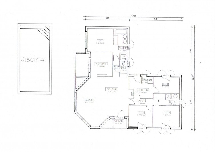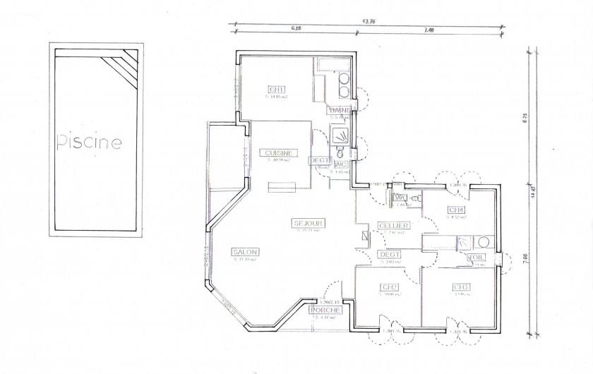 La maison se compose d'un grand séjour avec cuisine US, de 4 chambres, d'une salle de bain, d'une salle d'eau et de 2 WC séparés.