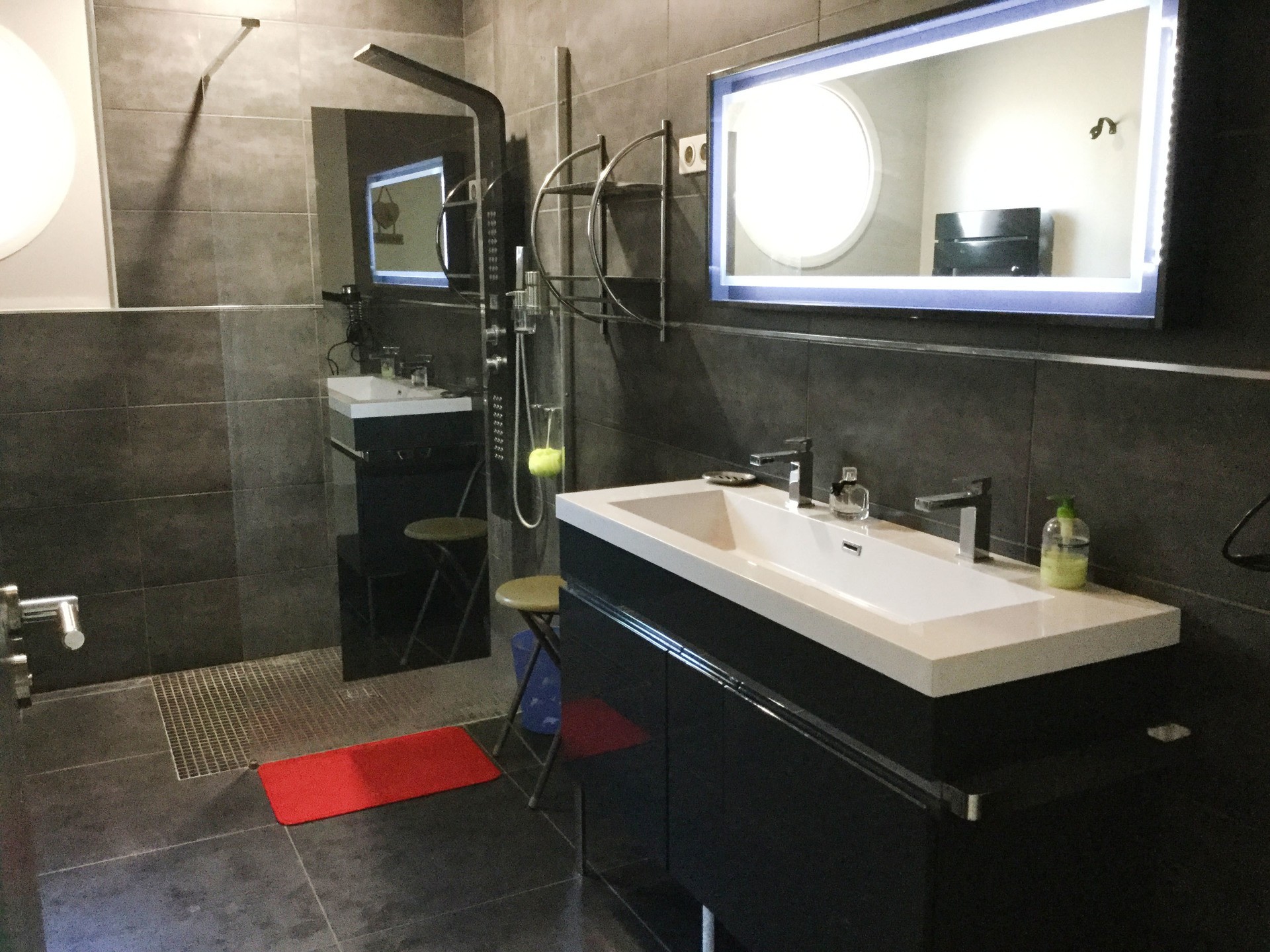 1 salle d’eau (7,5m²) avec une douche et deux vasques.
