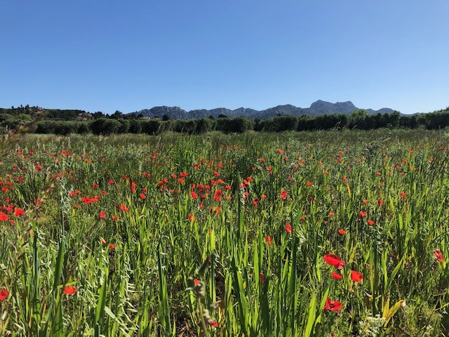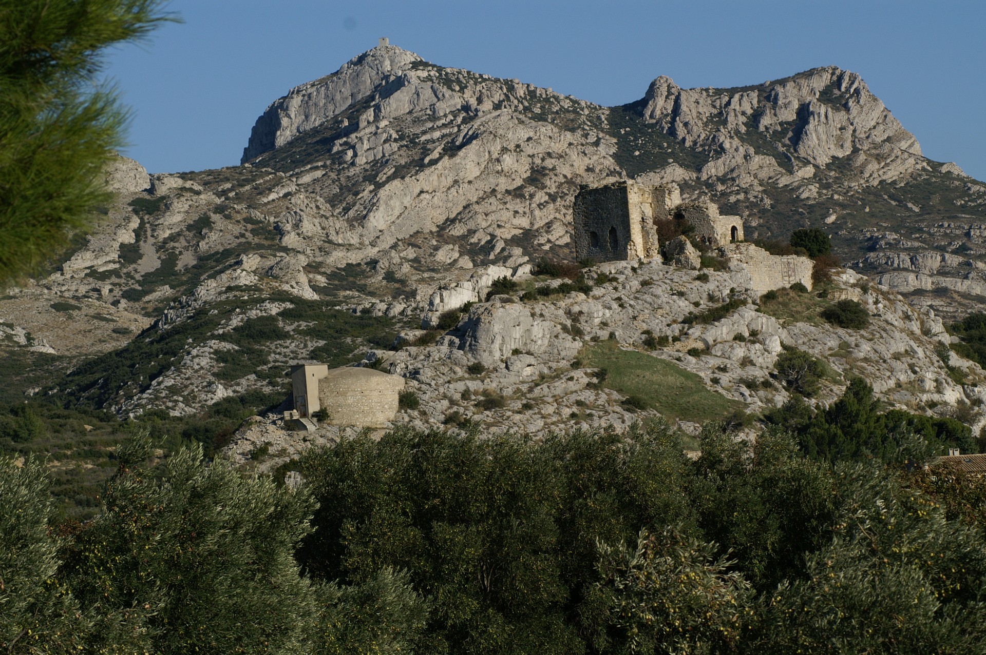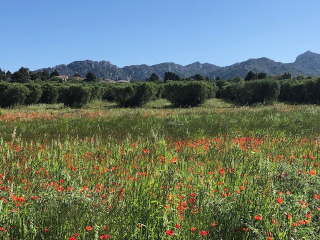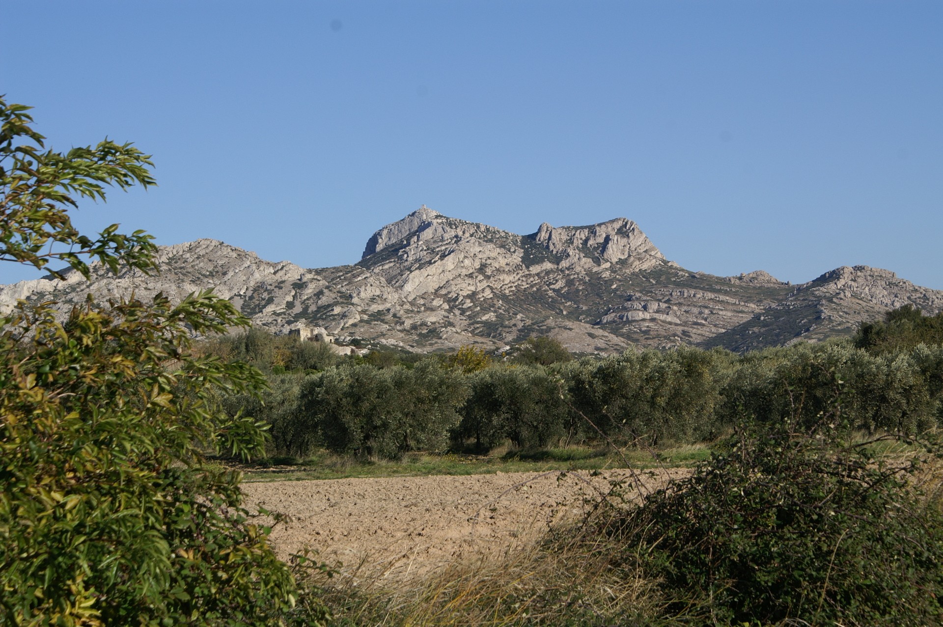 Les paysages alentour sont très typiques : Roche calcaire surplombée par les Opies, Oliveraies.