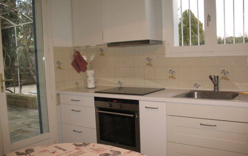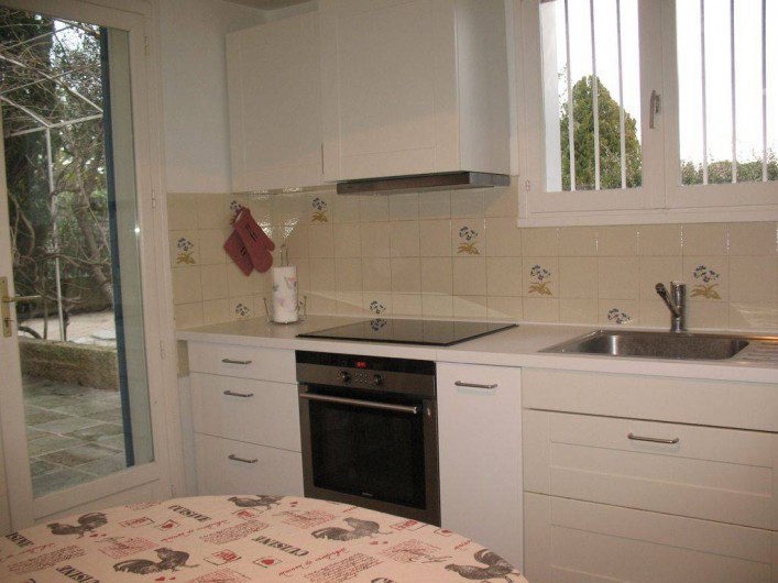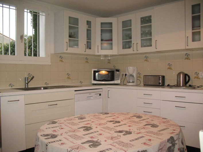 La cuisine séparée et le séjour/salon s'ouvrent sur une terrasse plein sud avec pergola, salon de jardin et barbecue.