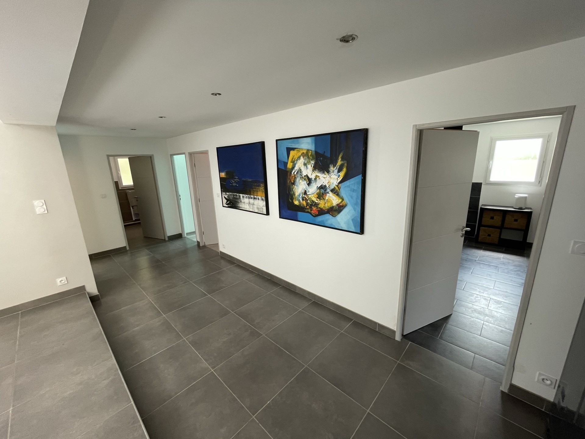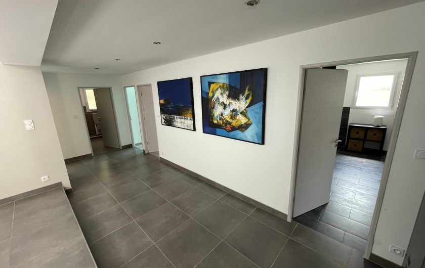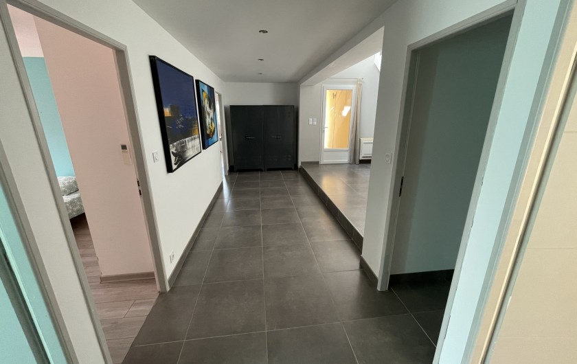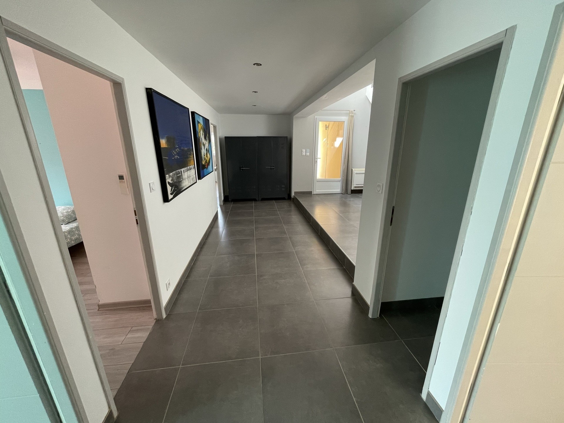 Au niveau inférieur vous y trouverez « l’espace nuit & repos » avec 4 chambres, 2 salles de bain, 1 WC et l’accès à la piscine.