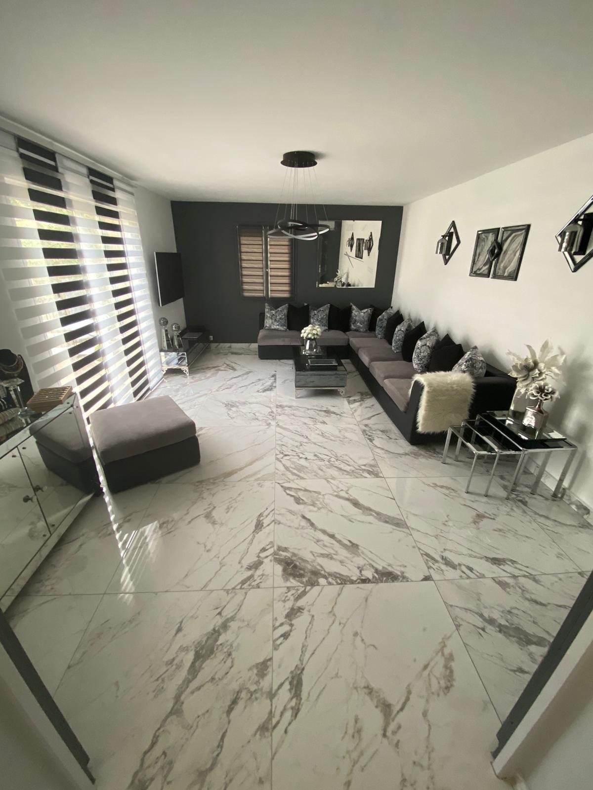 1 salon de 25 m2 avec un grand canapé 8 places et une grande télé de 140cm
