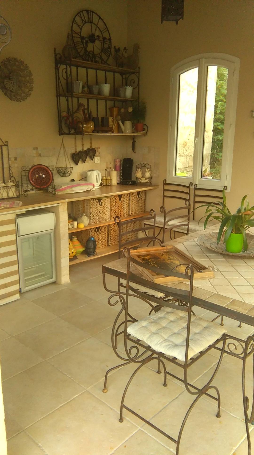 Cuisine d’été avec 1 grande table et 8 chaises ; 1 barbecue-plancha à gaz ; chaises longues