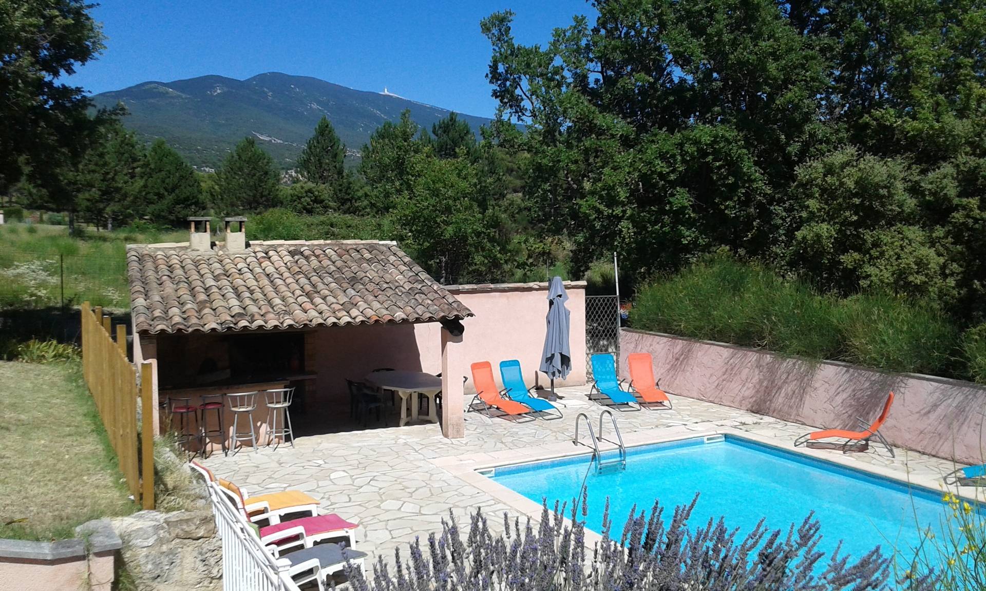 Villa calme et spacieuse (200 m2) tous confort, avec terrain clôturé (env 1000 m2),1 grande terrasse (240 m2) très ensoleillé avec tonnelle de vigne vierge pour les repas à l ombre , vue directe sur le Mont Ventoux (face sud);sur la terrasse 1 table de ping-pong et 1 panier de basket-bal avec ballon,sur la pelouse 1 maisonnette pour enfant et ses jeux.