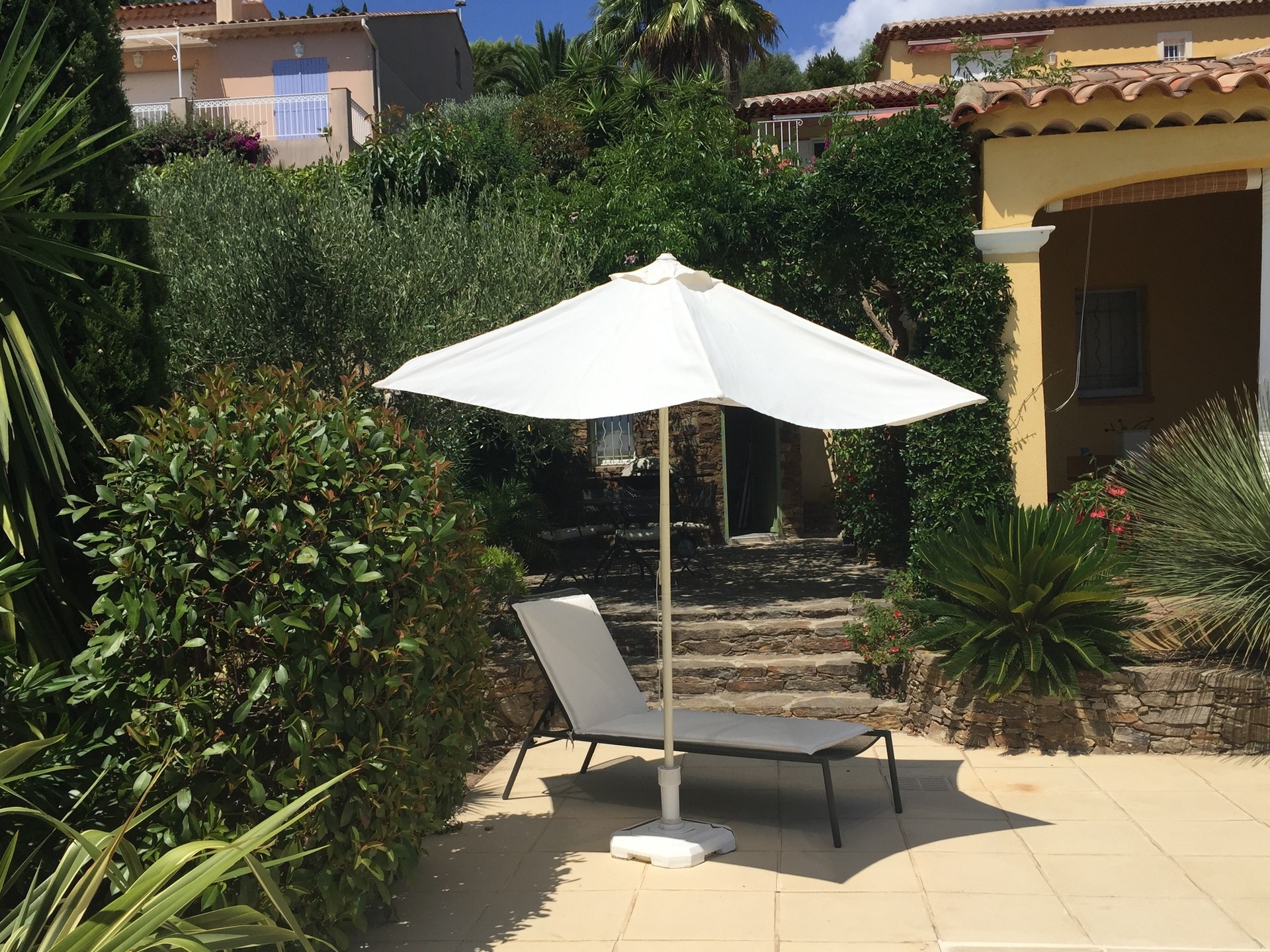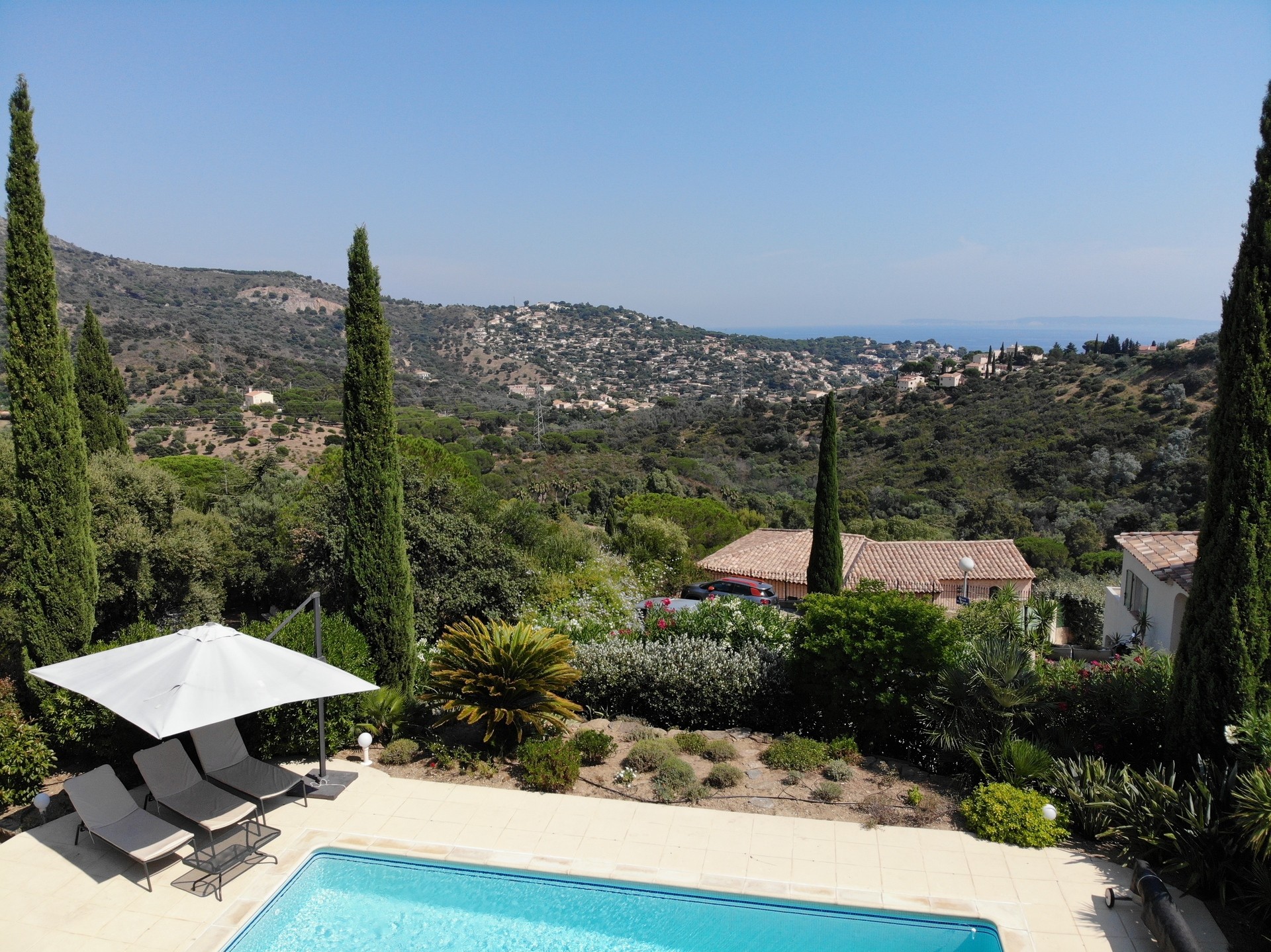 Maison de 130 m², située à 400 m du vieux village de Bormes Les Mimosas et à 3 km des plages, construite sur un terrain clos de 875 m² ; deux terrasses, une couverte et l'autre végétalisée, piscine carrelée entourée d'une grande plage et d'un jardin paysagé ; très belle vue mer sur les Iles du Levant.