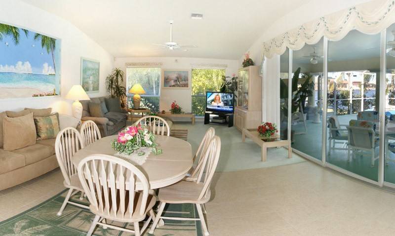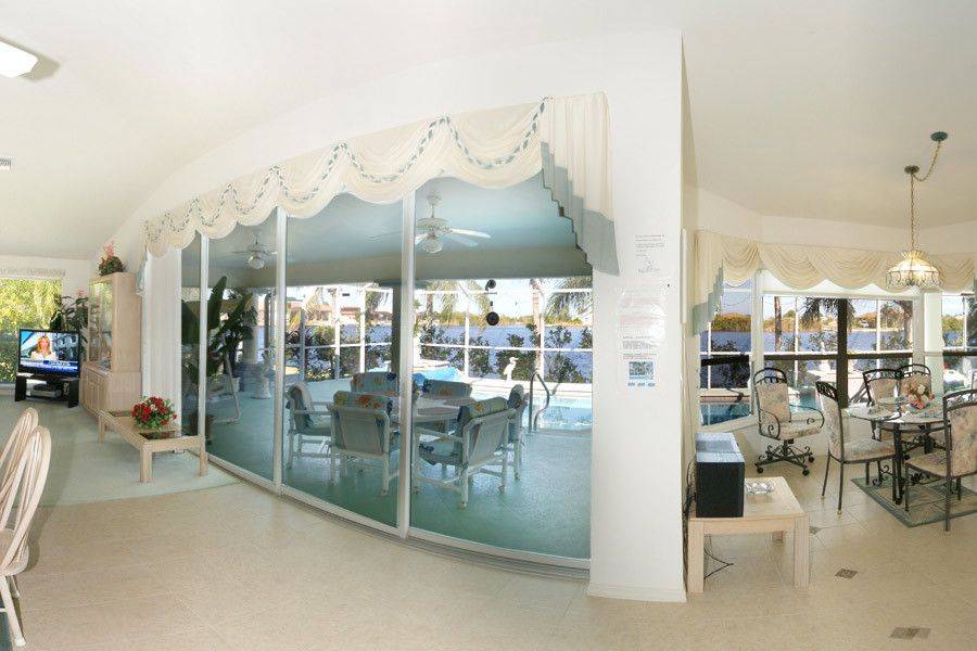 Grande salle de séjour avec des fenêtres panoramiques entièrement vitrées. La piscine large et longue invite à vous détendre et nager dans la piscine chauffée solaire agréable.