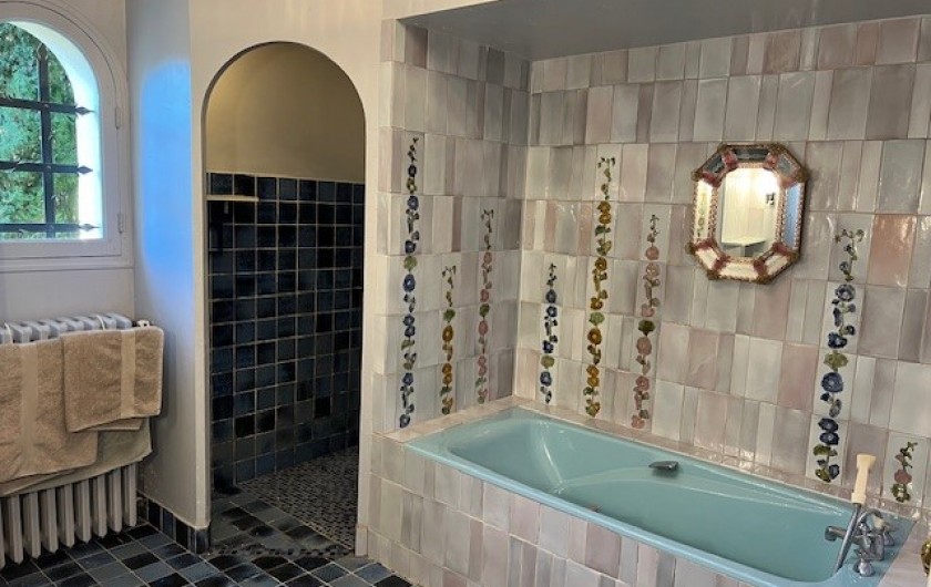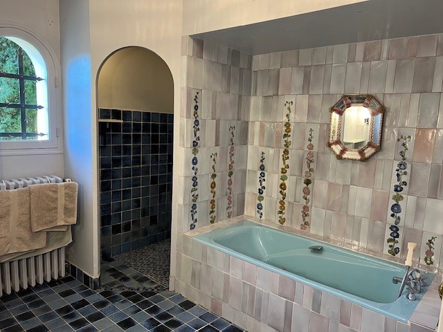 - une salle de bain avec douche et bidet, toilette séparée, avec carrelage en céramiques de Roquefort-LaBédoule,