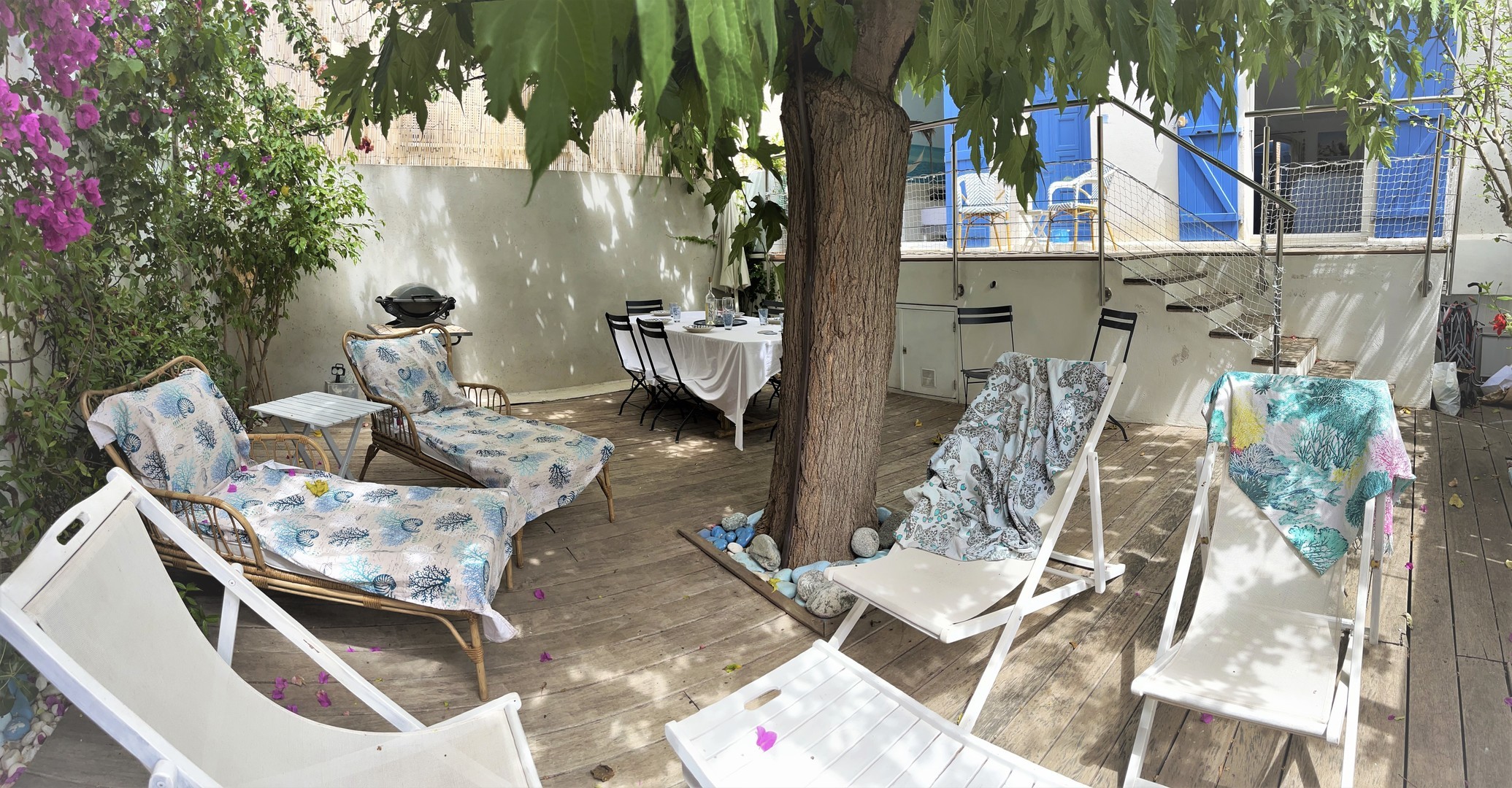 Dans le jardin ombragé vous pourrez déjeuner à l'ombre du murier (tables, chaises, transats, barbecue).
