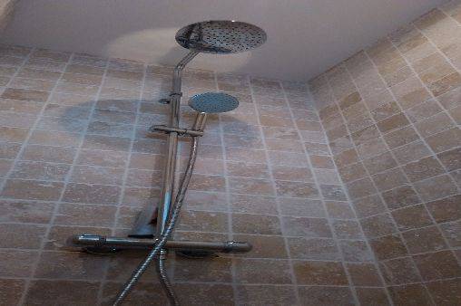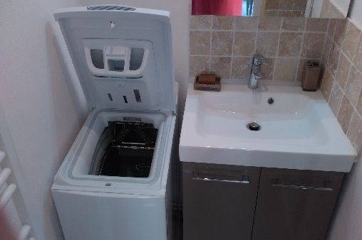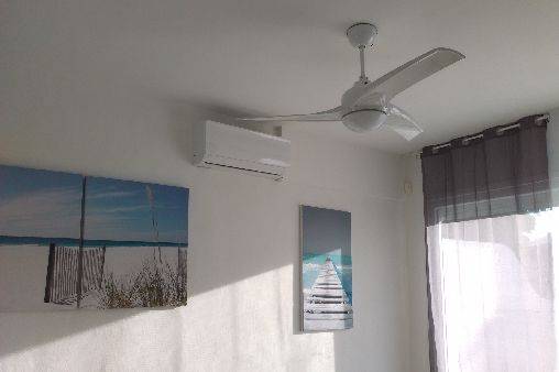 Une chambre séparée avec ventilateur plafonnier, un WC séparé, une salle bain avec douche à l'italienne, Lave Linge et Sèche serviette (Radiateur).