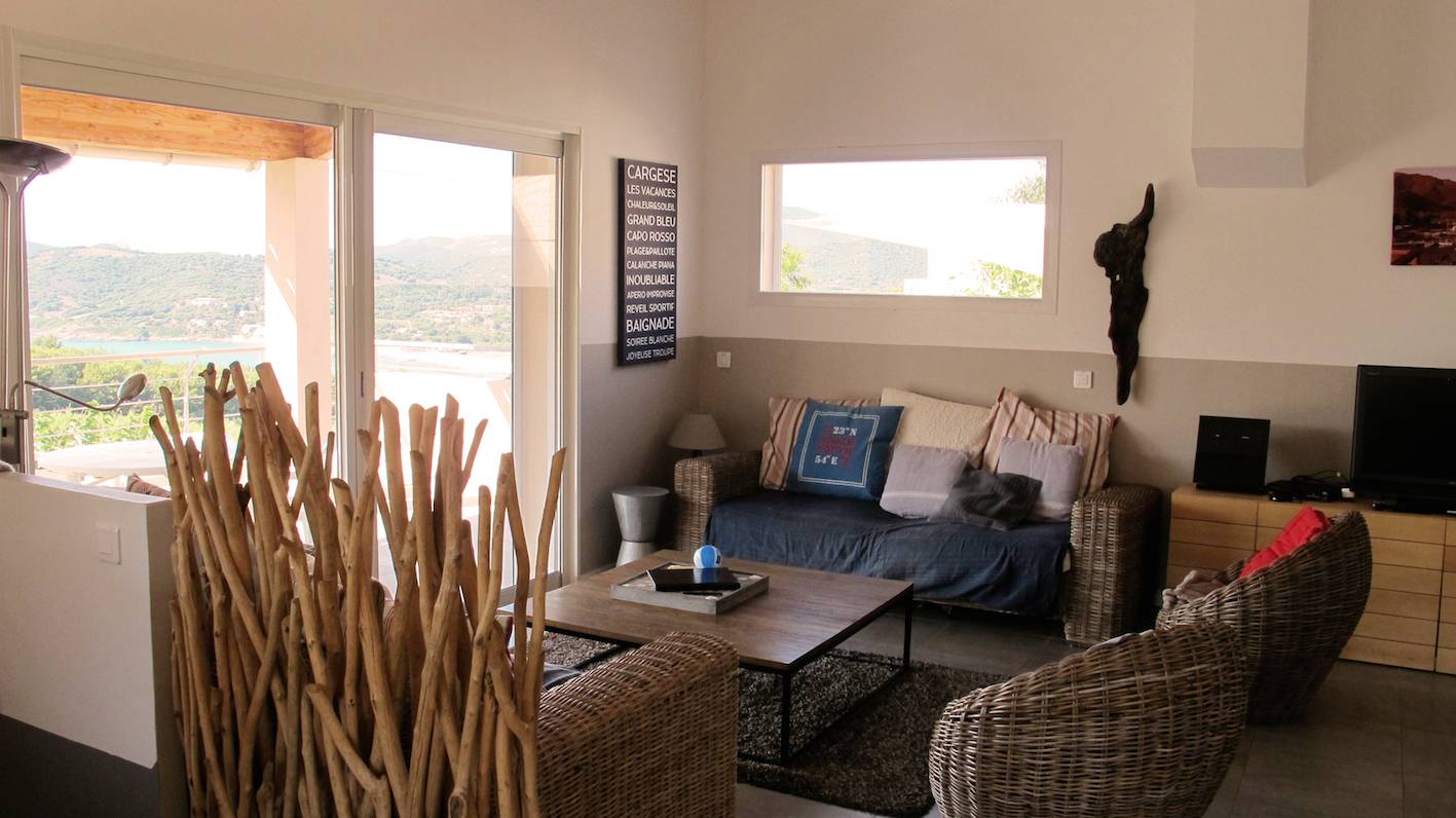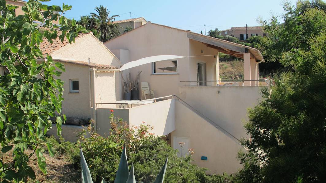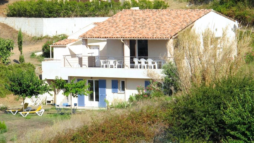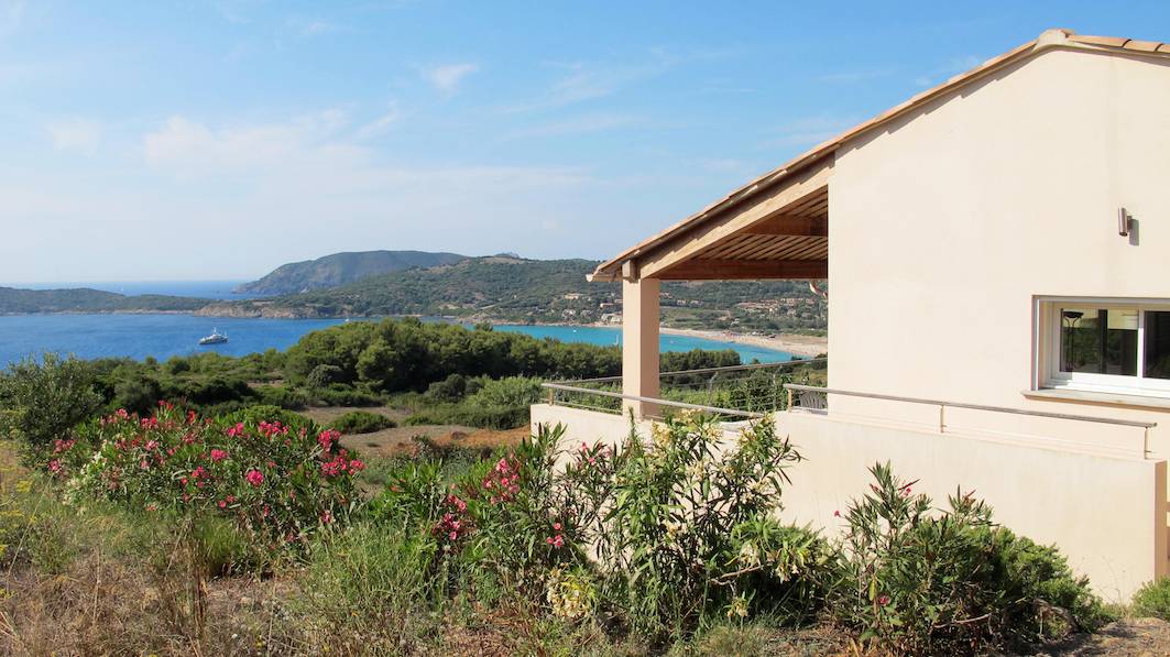 Le Jardin autour de la maison n'est pas clôturé. Vue sur la baie du Pero avec le Capo Rosso à l'horizon.