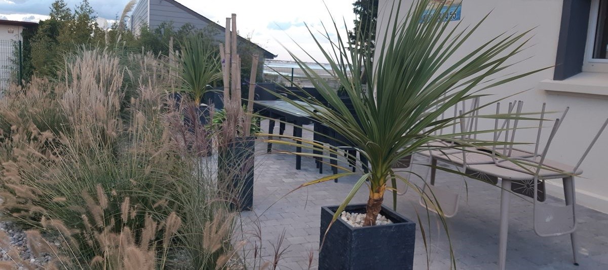 1 terrasse avec un salon de jardin et barbecue