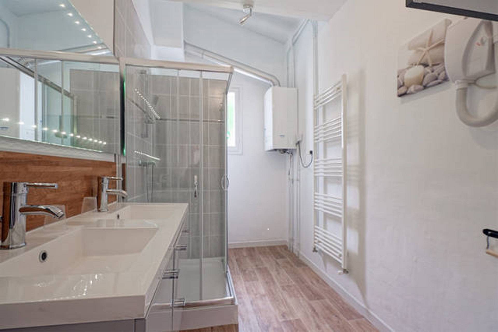 - d'une salle d'eau double vasque, wc suspendu, et sèche cheveux équipée d'un grand miroir LED, machine à laver le linge,
