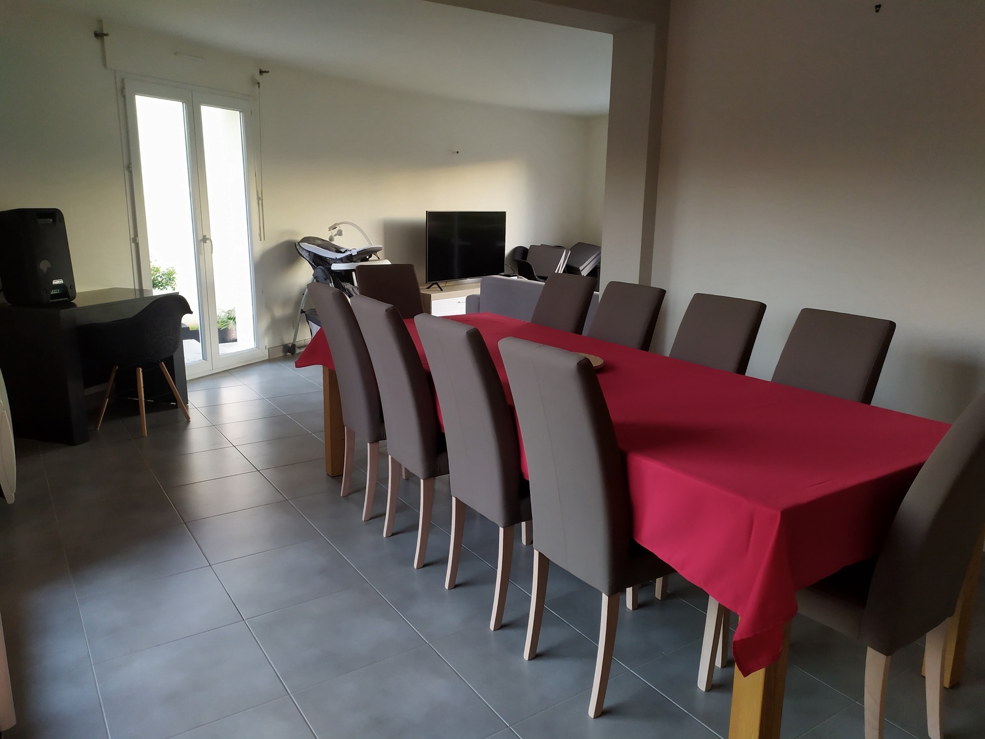 Salle, salon donnant sur une terrasse avec un salon de jardin en résine d' un canapé 8 a 10 personnes , 4 chaises scandinave écran plat 150 cm , salle à manger pouvant recevoir entre 12 et 14 personnes.
