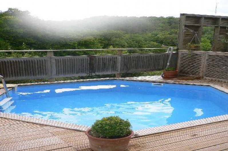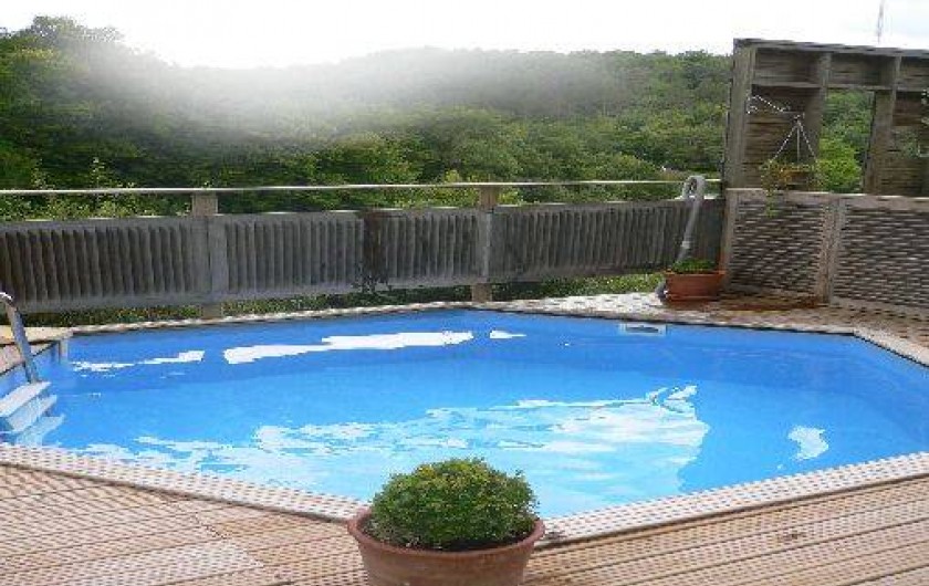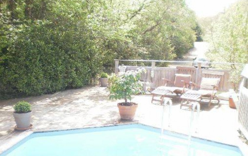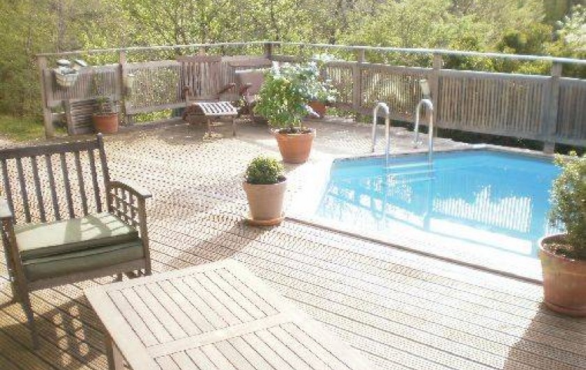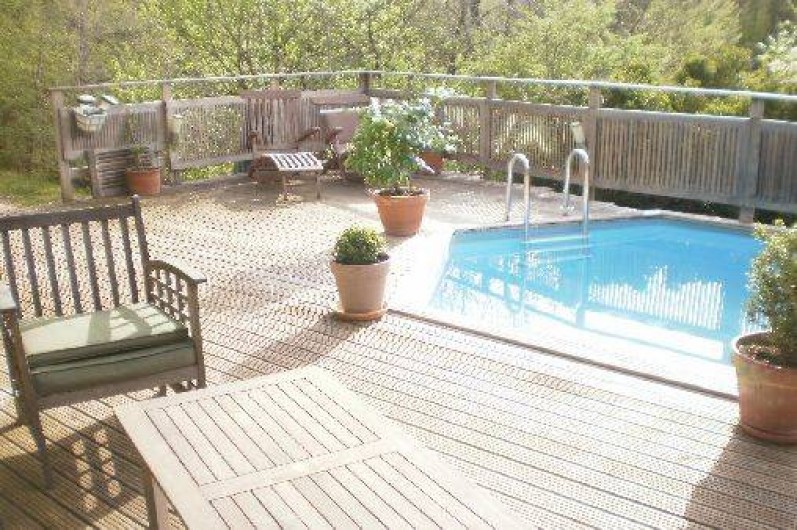 Elle est construite sur pilotis, intégrée dans la végétation, buis et chêne, avec une grande terrasse, couche de soleil dans la piscine, qui fait 5 mètres de diamètre.