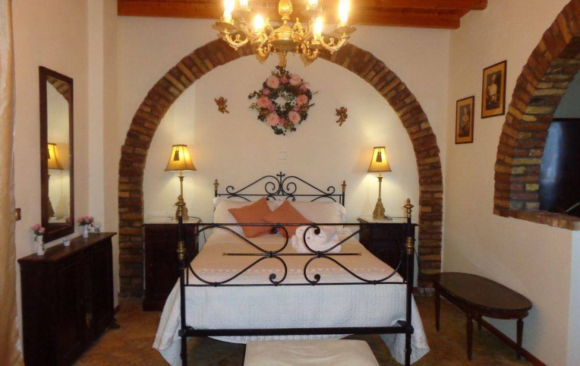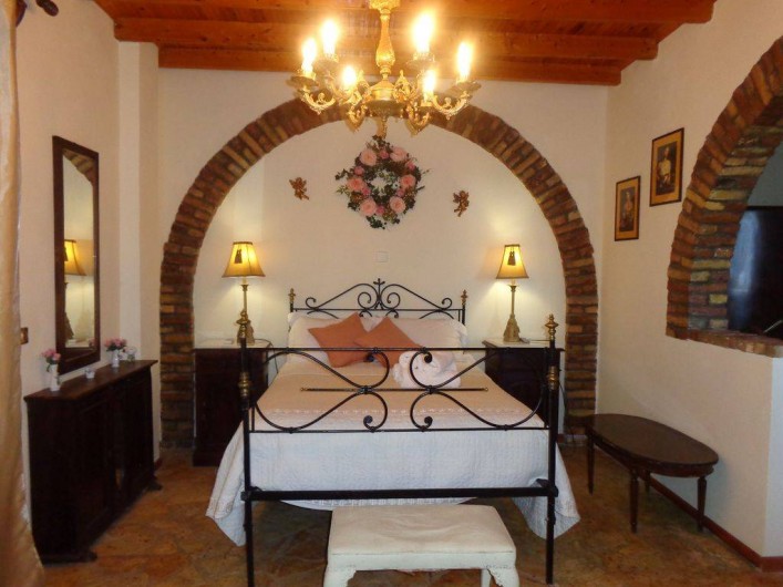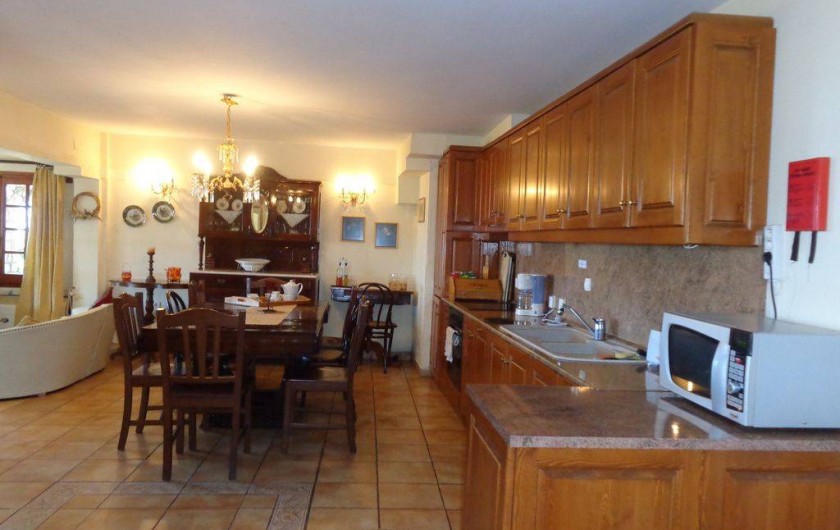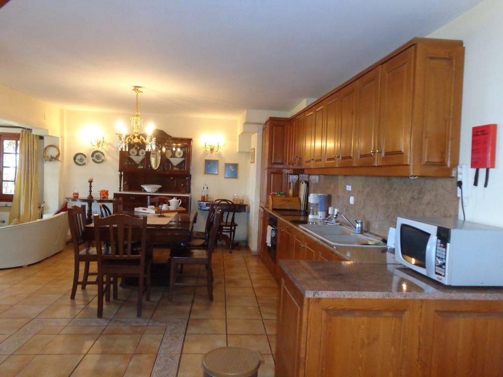Un escalier mène à l'étage inférieur. A ce niveau est un salon et une grande cuisine / salle à manger à aire ouverte qui est bien équipé pour Villa en location vacances. Il y a une autre salle de bain située à ce niveau pour plus de commodité. Les portes-fenêtres donnent sur la charmante terrasse de la piscine et le jardin.