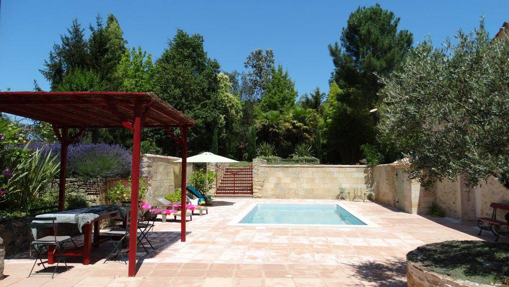 La piscine se situe dans un patio avec une grande terrasse autour , la tonnelle permet de s'installer tranquillement pour manger le midi ou le soir .