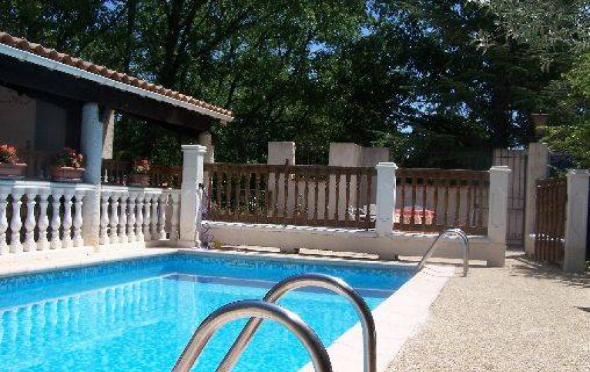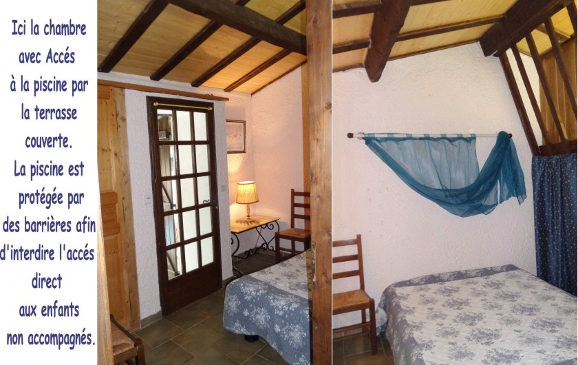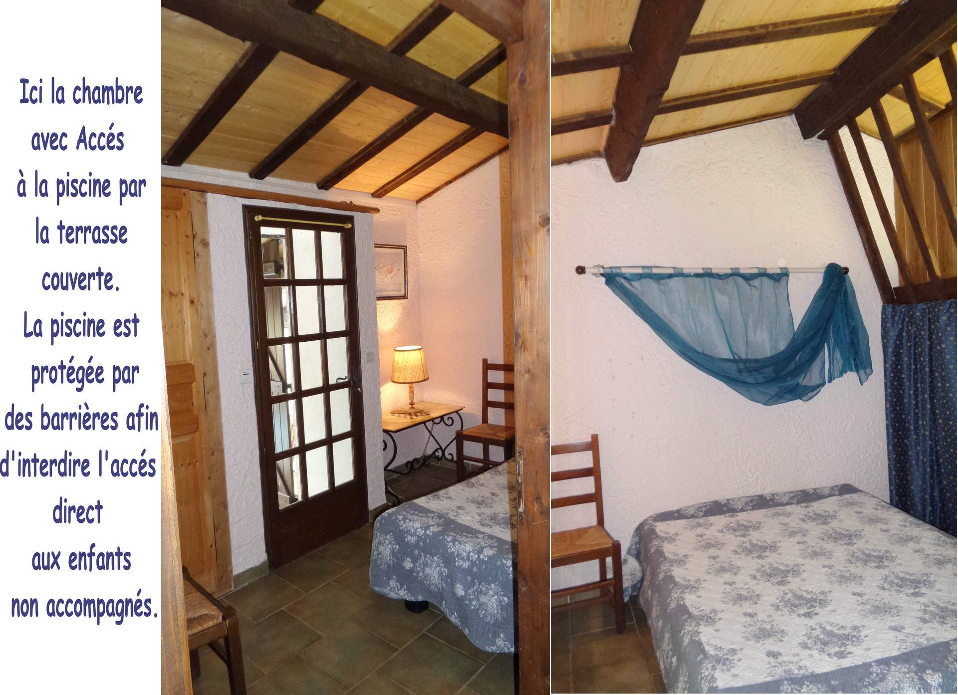 équipée d'un lit de bébé. De la mezzanine on arrive sur une terrasse couverte à proximité de laquelle se trouve la piscine qui est protégé par d'élégantes barrières en bois, a l'intérieur de laquelle il a une terrasse solarium, avec bains de soleil et parasol. L'accès à la piscine est protégé par deux portillons dotés d'une serrure sécurité spéciale interdisant la manipulation aux enfants de moins de cinq ans.