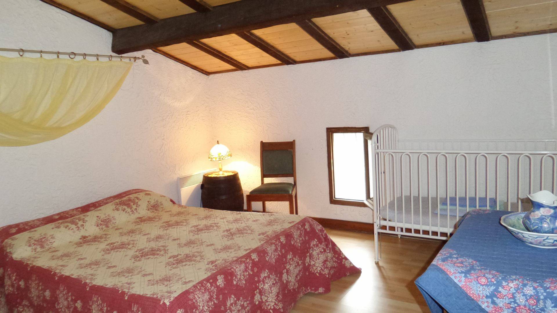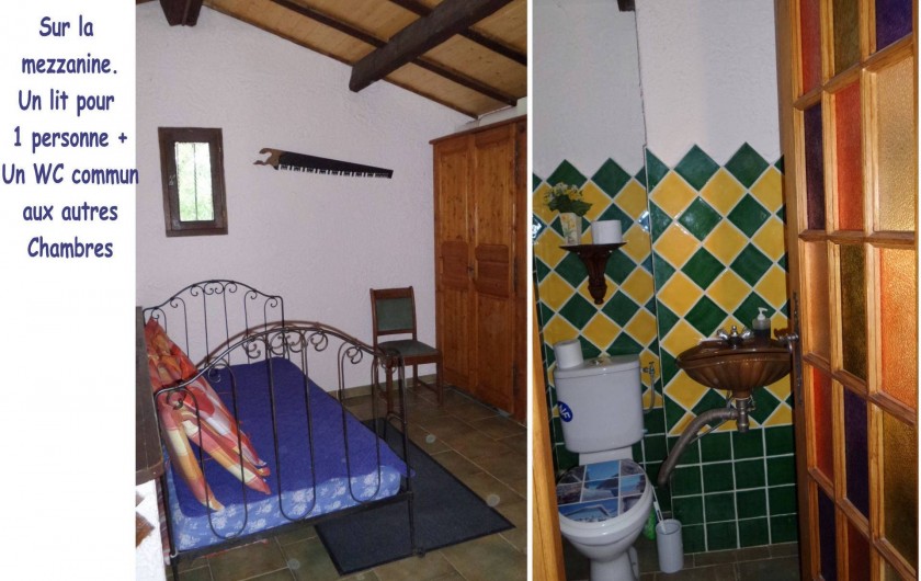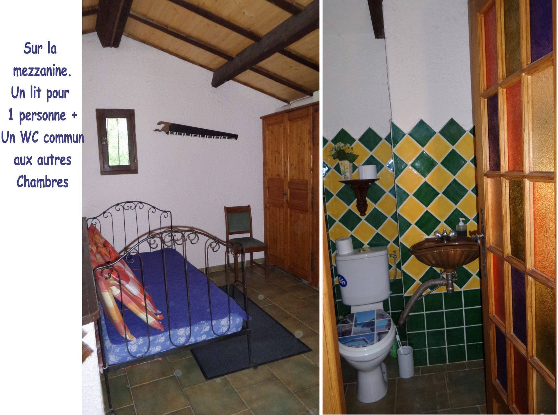 A l'étage se trouve la mezzanine avec un lit d'une personne et un 2ème WC. Deux chambres avec lits pour deux personnes dans chacune d'elles. Une d'entre elles est