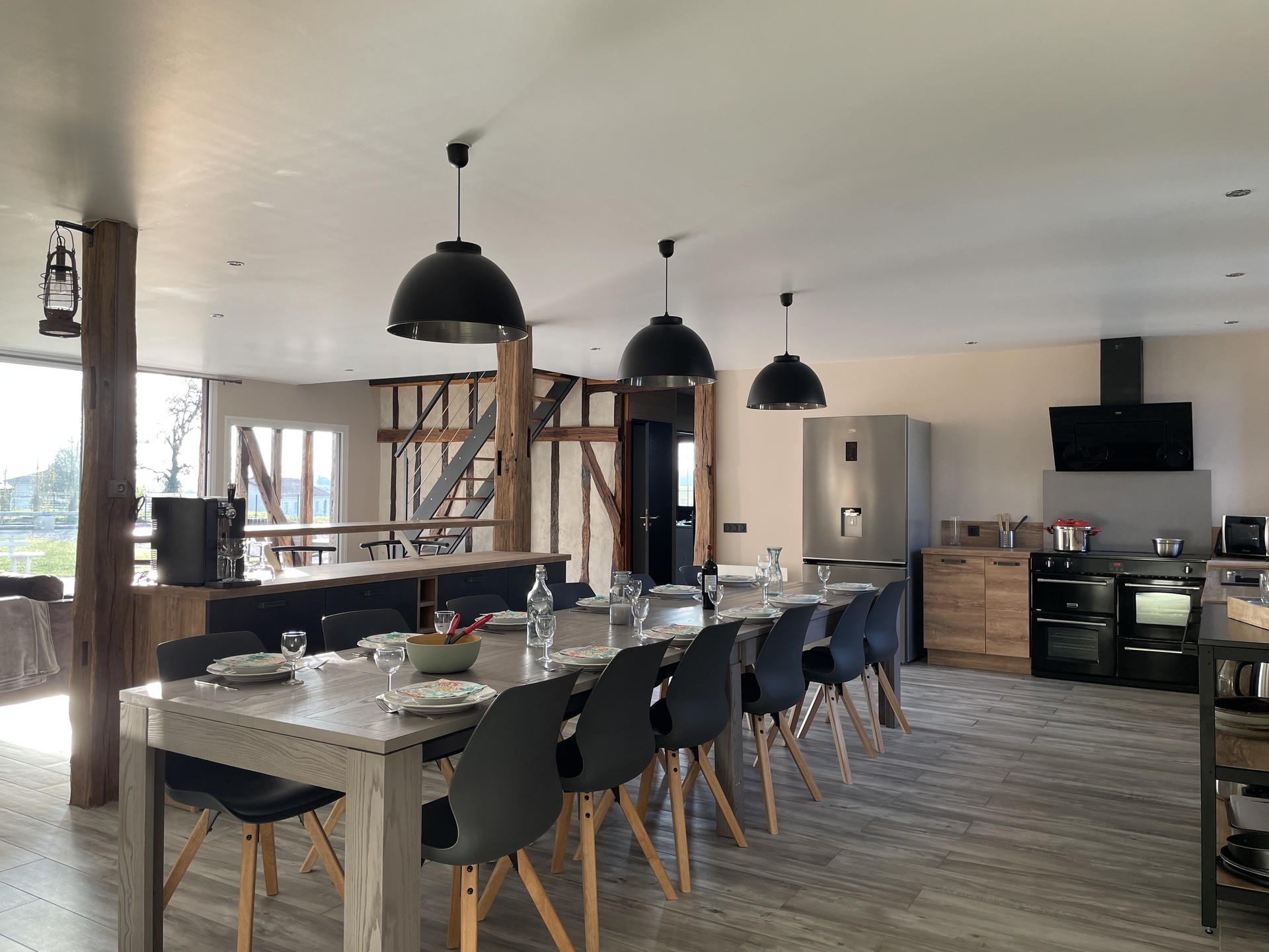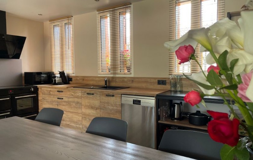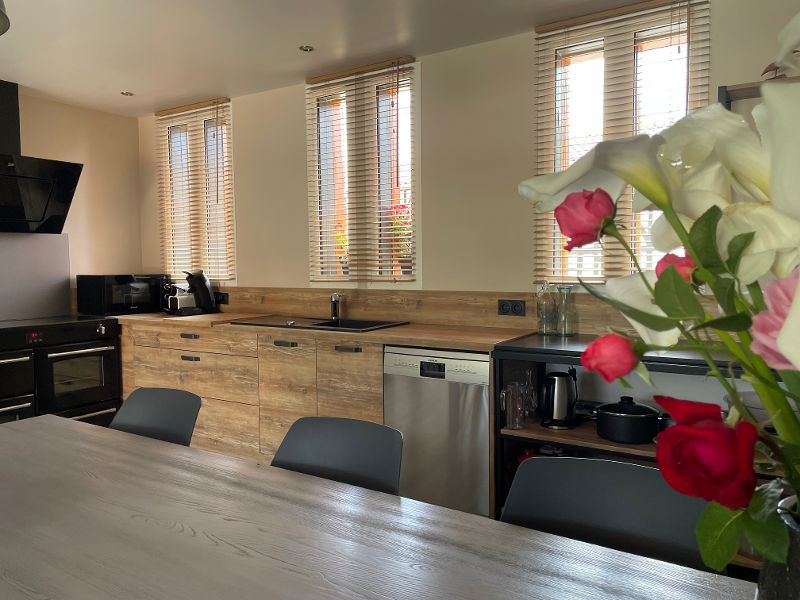 Une cuisine comme chez les pro. : piano de cuisson, billot de cuisine, batterie de cuisine, lave-vaisselle, services à raclette, 3 machines à café : 1 Senseo , 1 Nespresso et 1 traditionnelle, 2 bouilloires, …