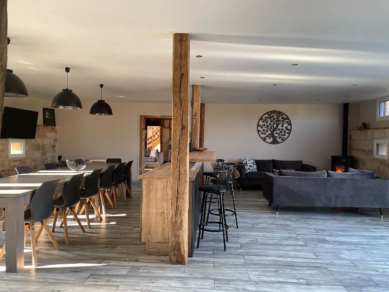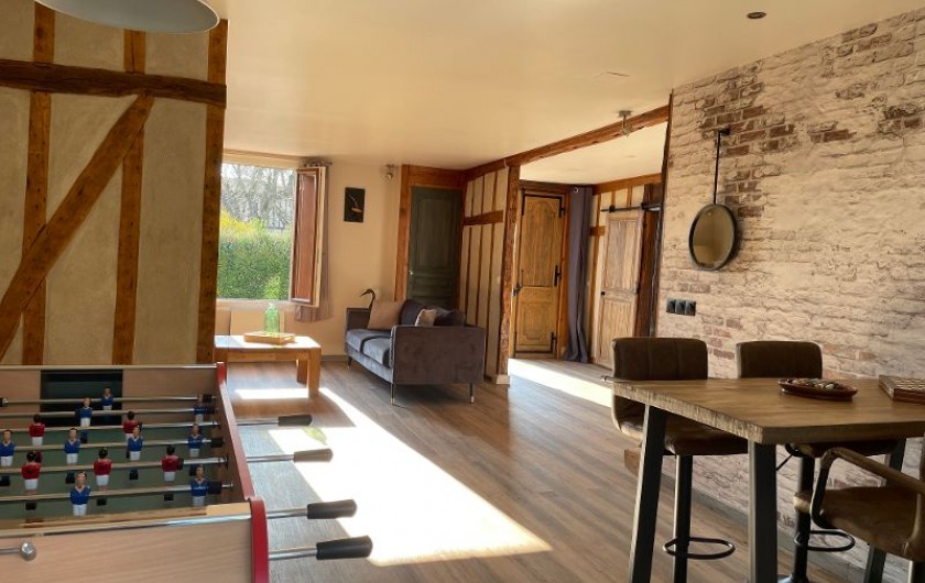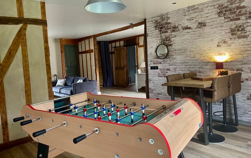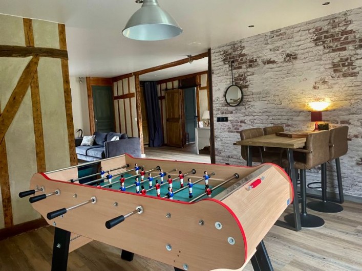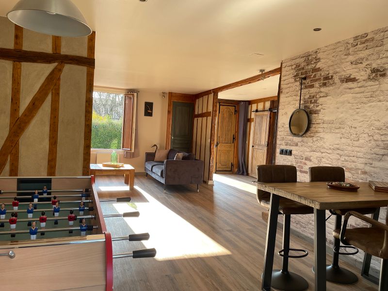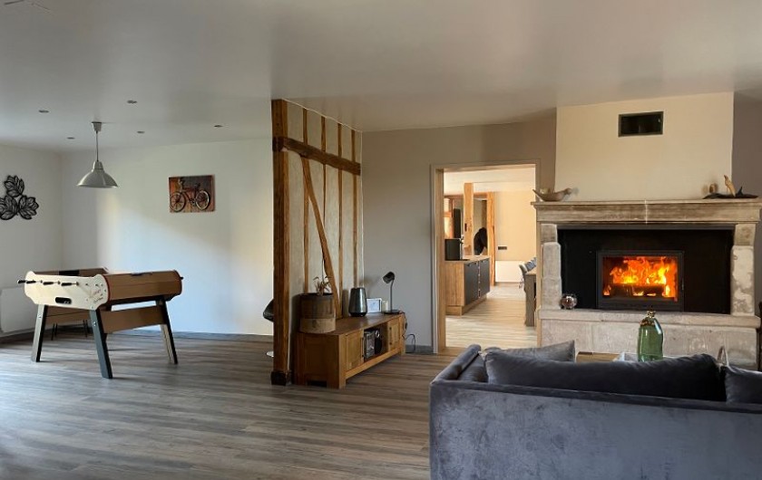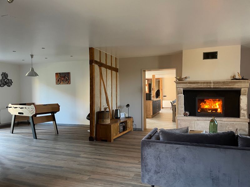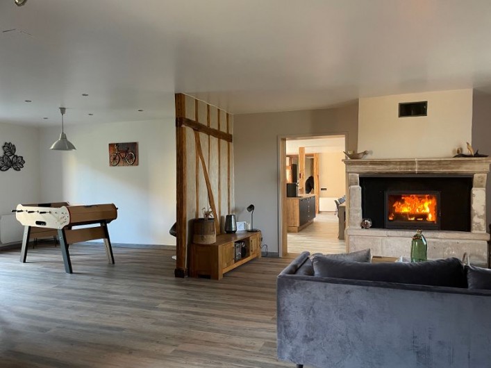 - le second salon, est installé autour de la belle cheminée en pierre, à côté de la salle de jeux, avec baby-foot