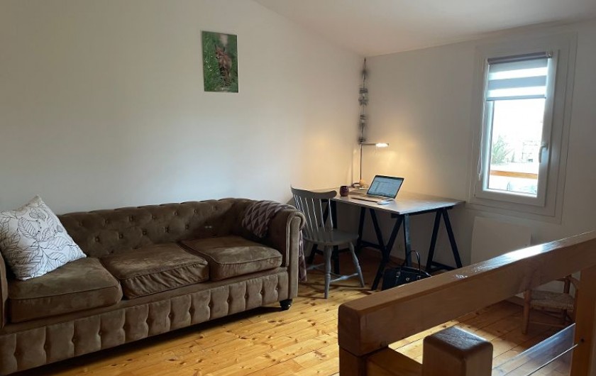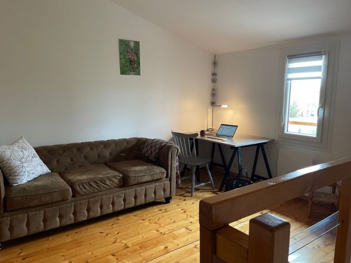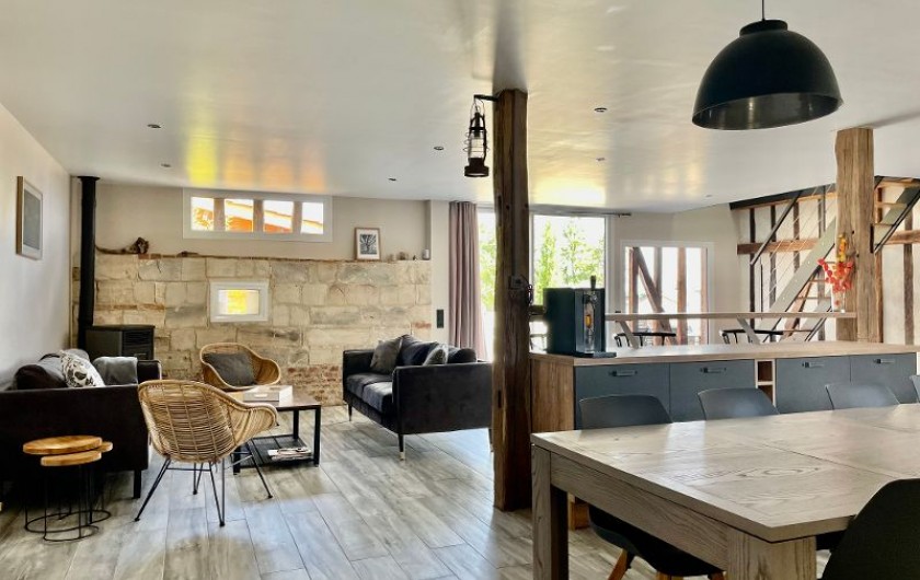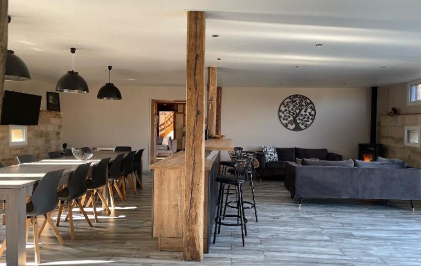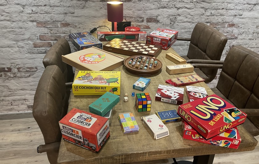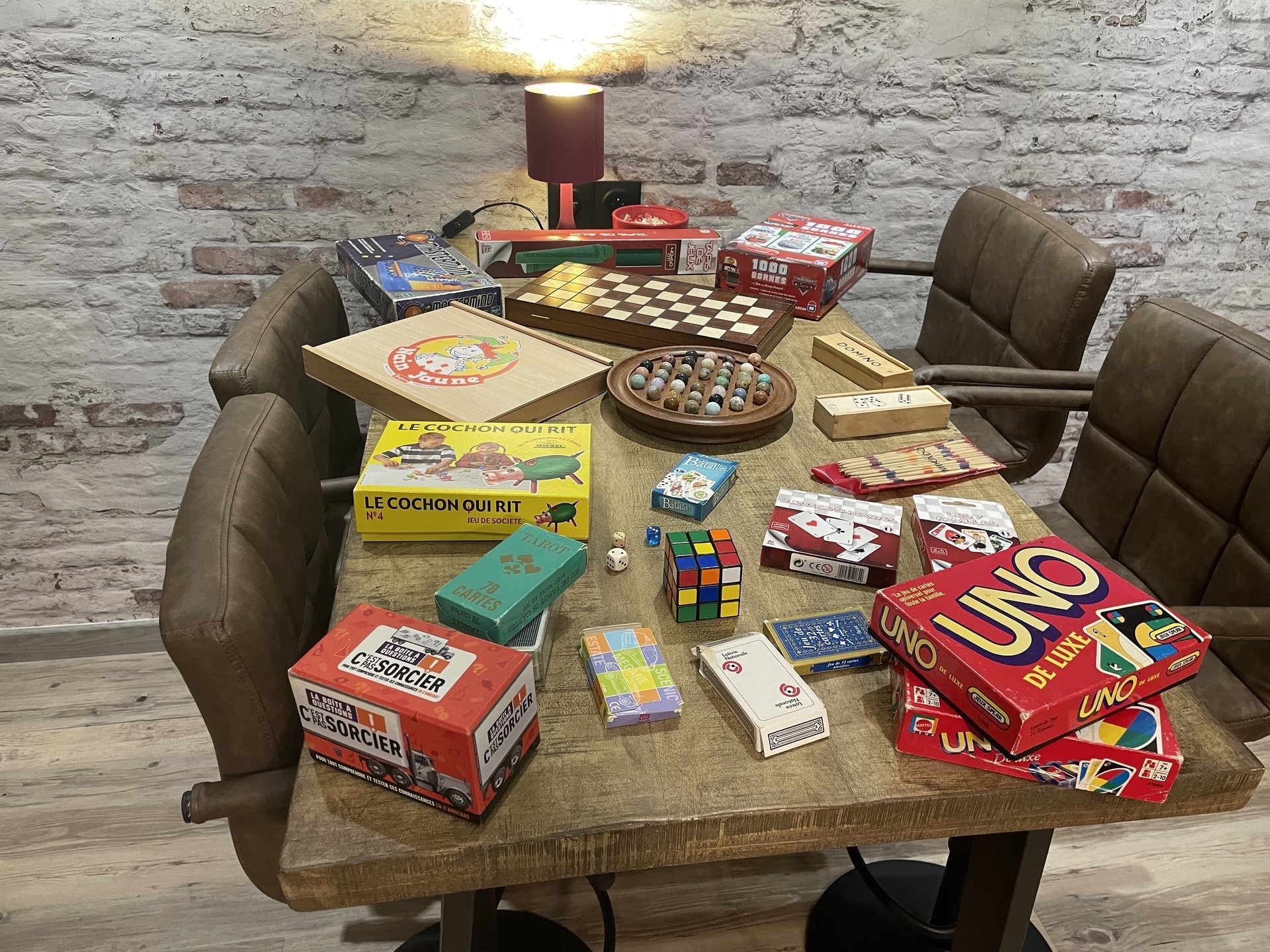 - le second salon, est installé autour de la belle cheminée en pierre, à côté de la salle de jeux, avec baby-foot